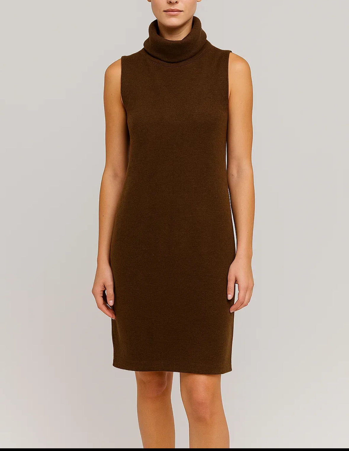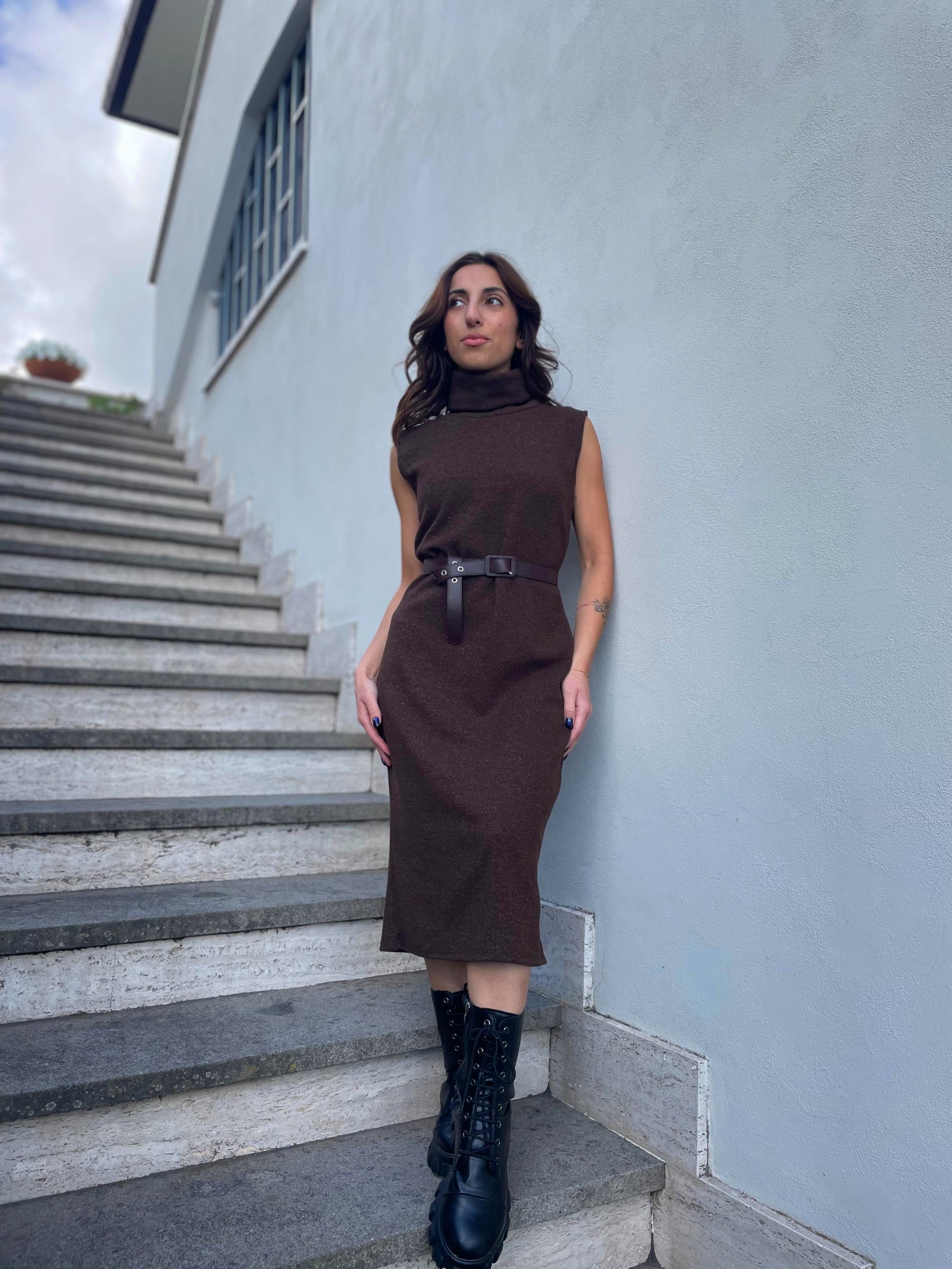 Abito lungo con collo morbido alto, smanicato, compreso di cinta.