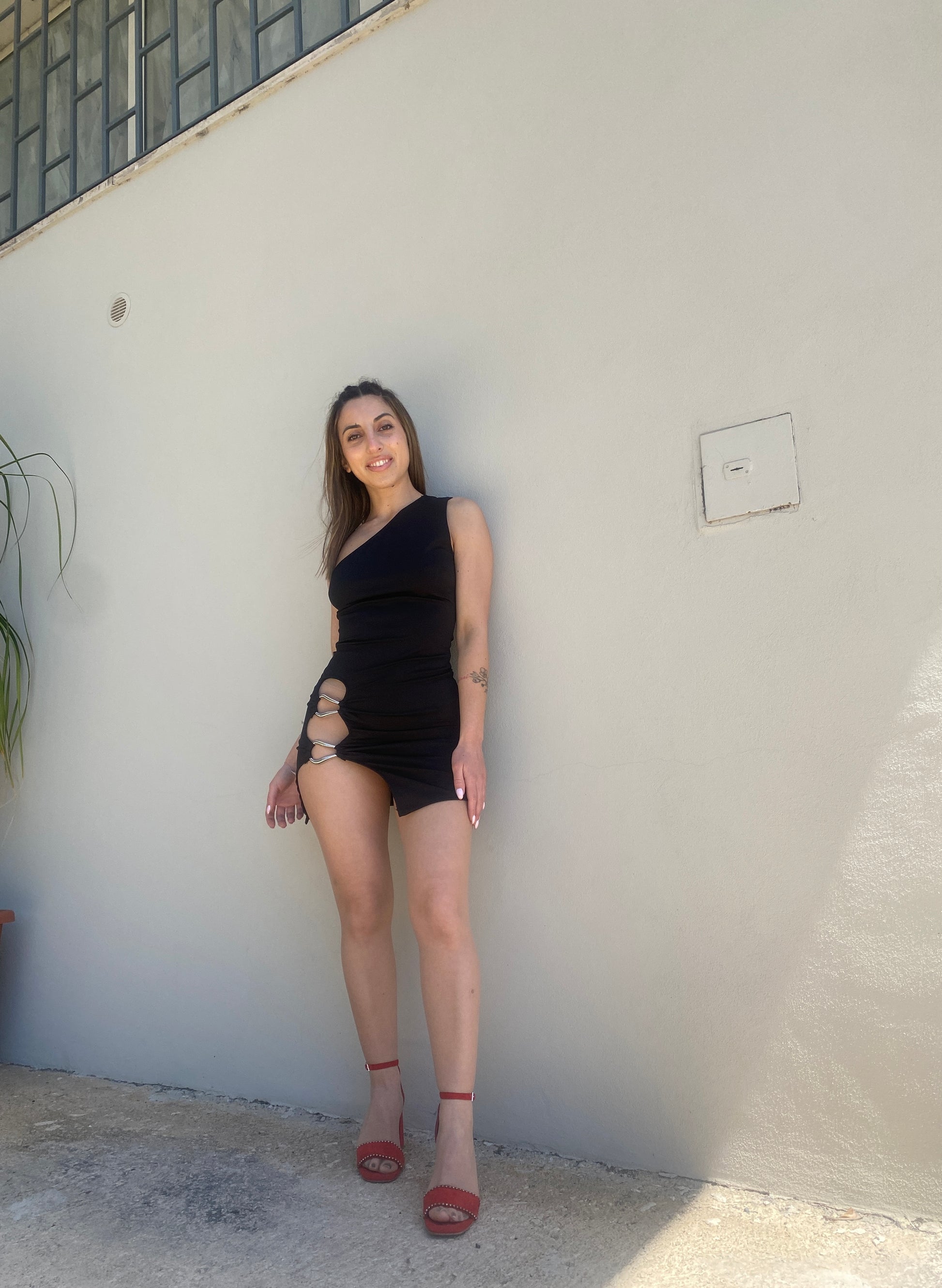 Vestito corto tessuto elasticizzato monospalla con dettaglio spacco accessorio. Perfetto per le vostre serate.
