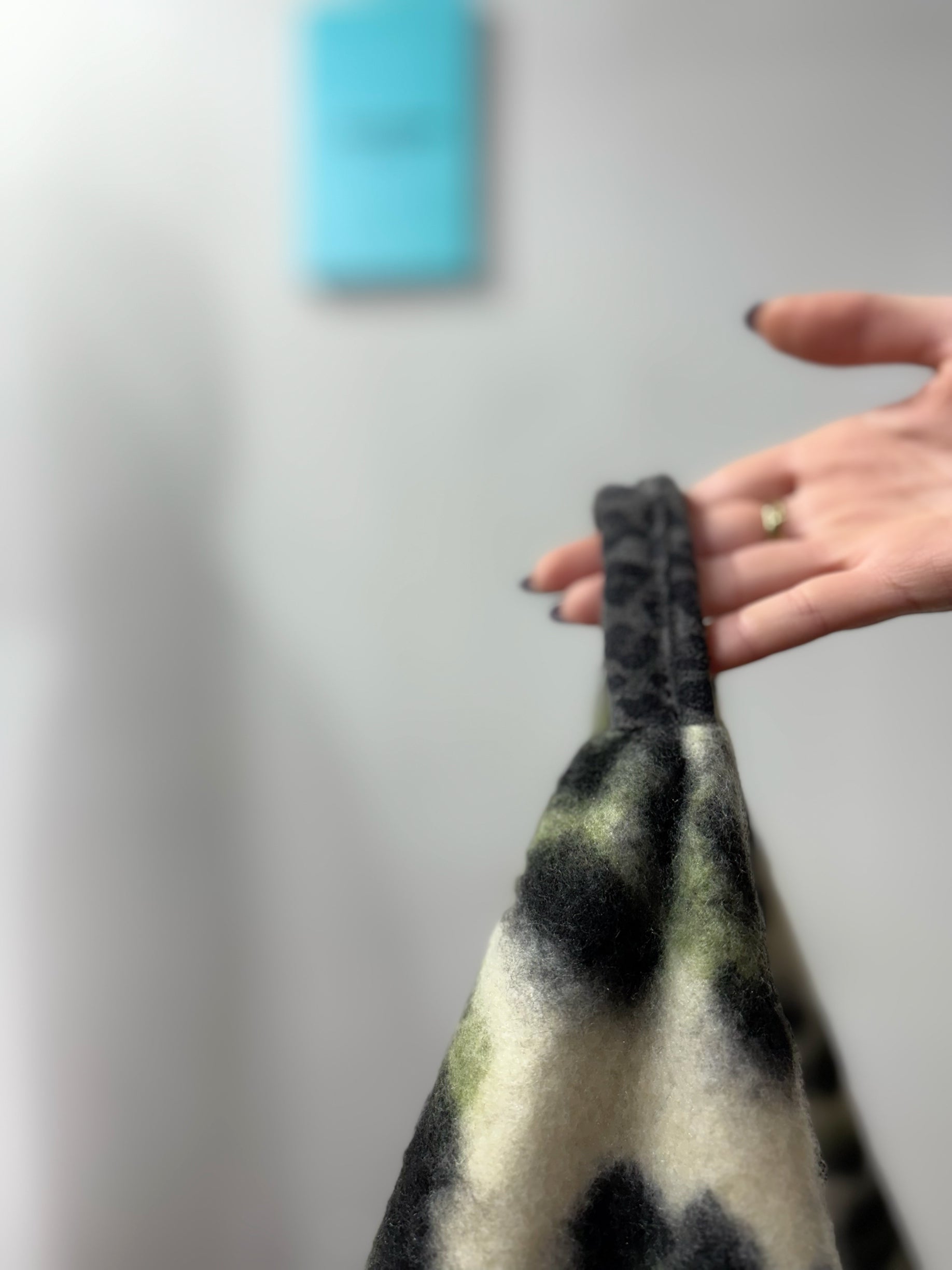 Borsa dimensione grande, in lana morbida con stampa maculata. Manico simil rigido.