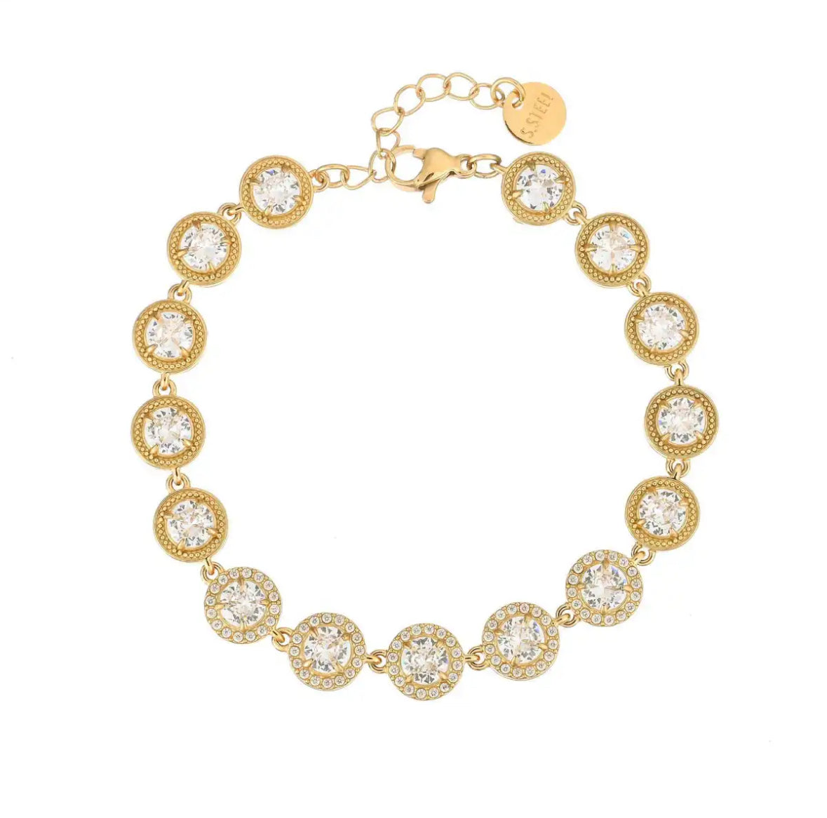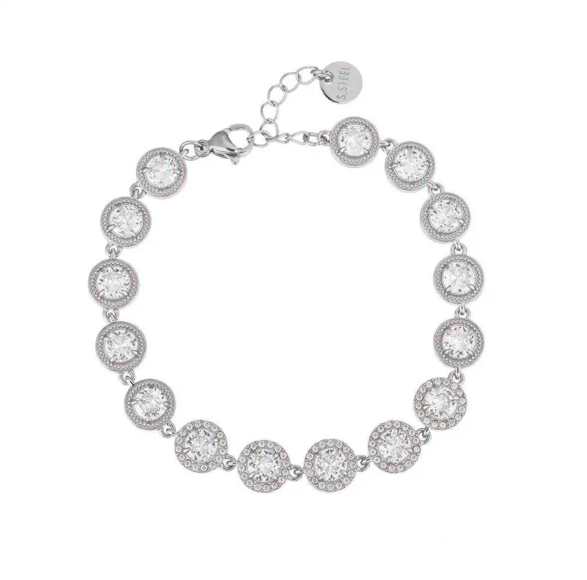 Bracciale con forma geometrica cerchio contornata da pietre piccole e pietre centrali, molto luminosa e può essere regolabile