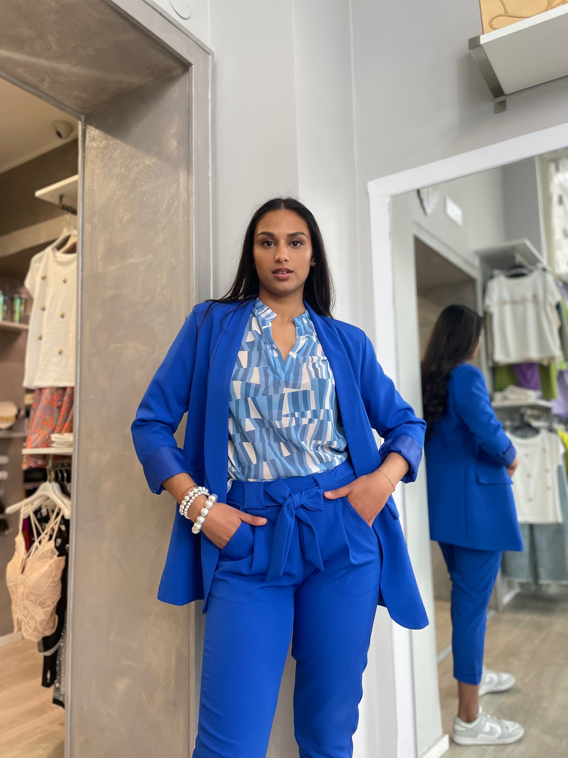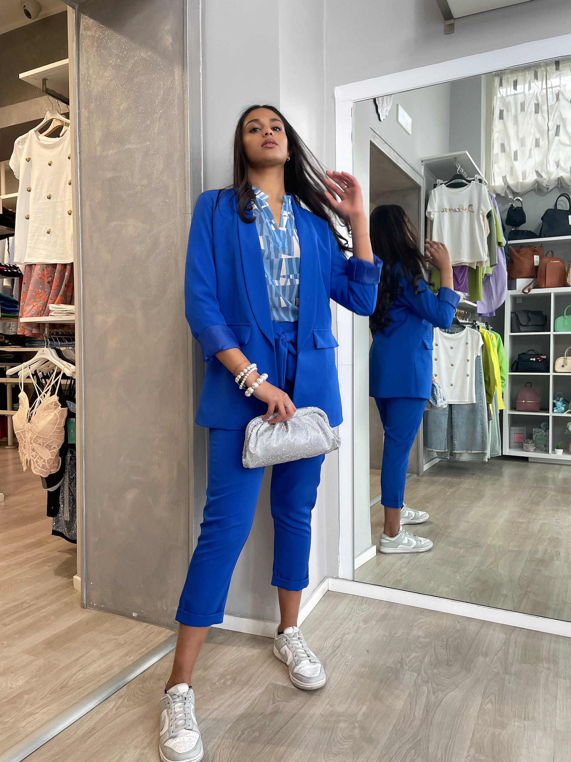 Giacca aperta con bavaro e foderata all’interno, pantalone modello boyfriend con elastico dietro.