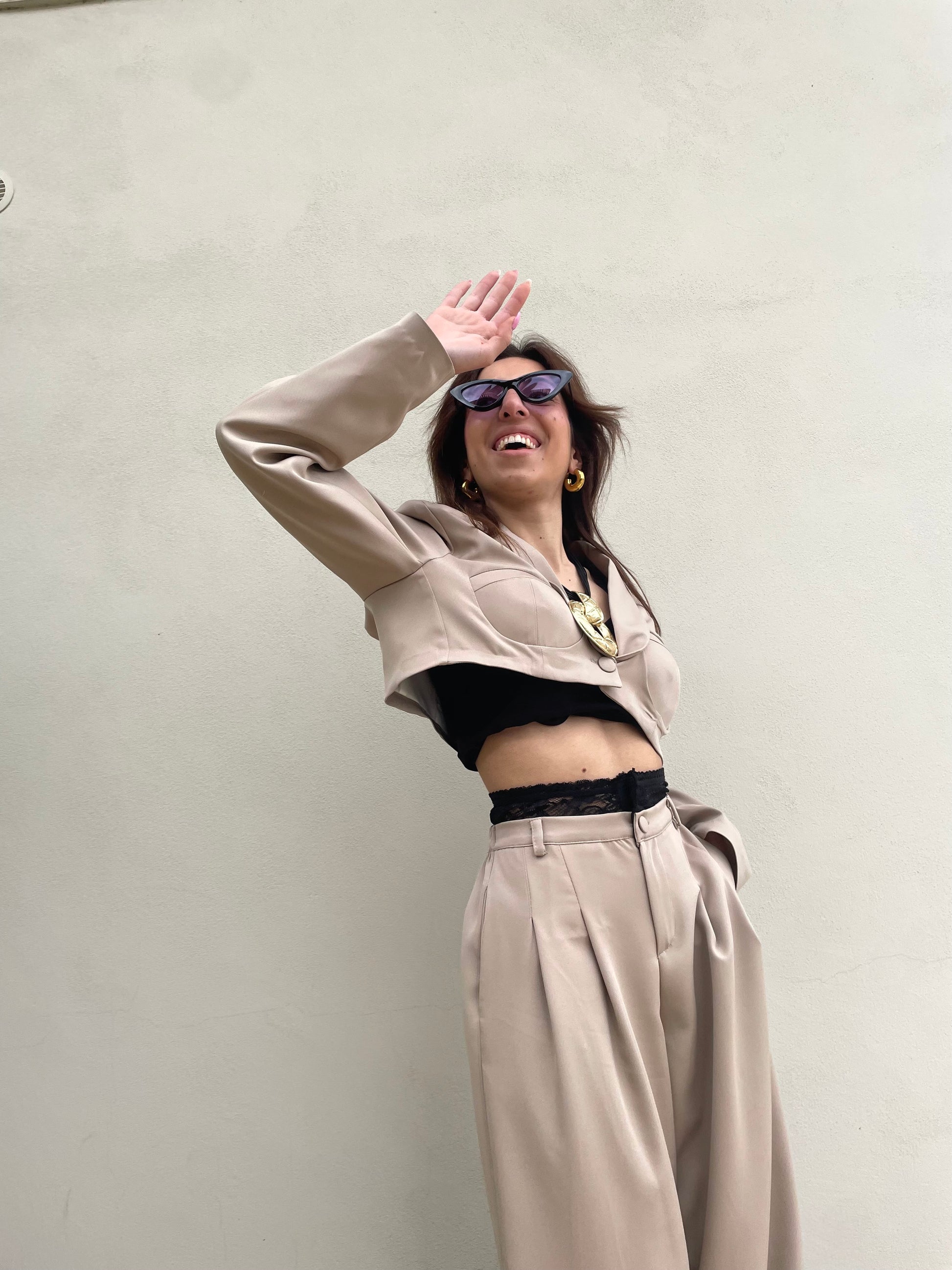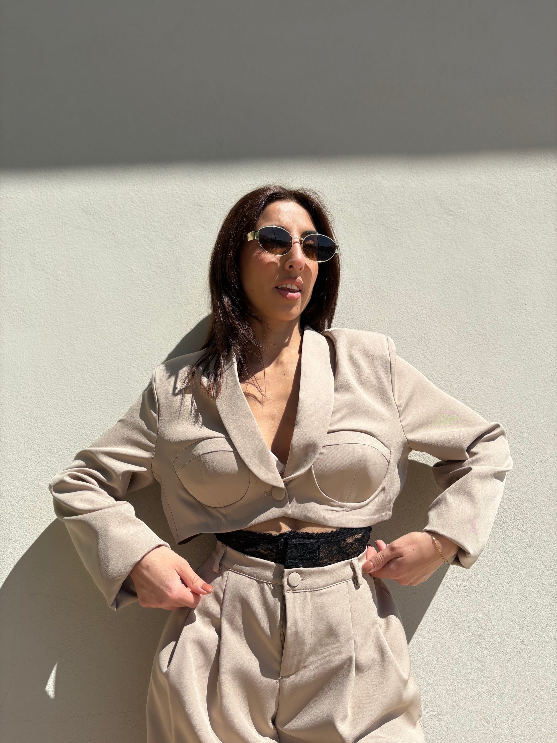 Completo con pantalone gamba larga e inserto che fuoriesce in pizzo sulla vita. Giacca corta con bavaro e bottone, all'interno ha le coppe.