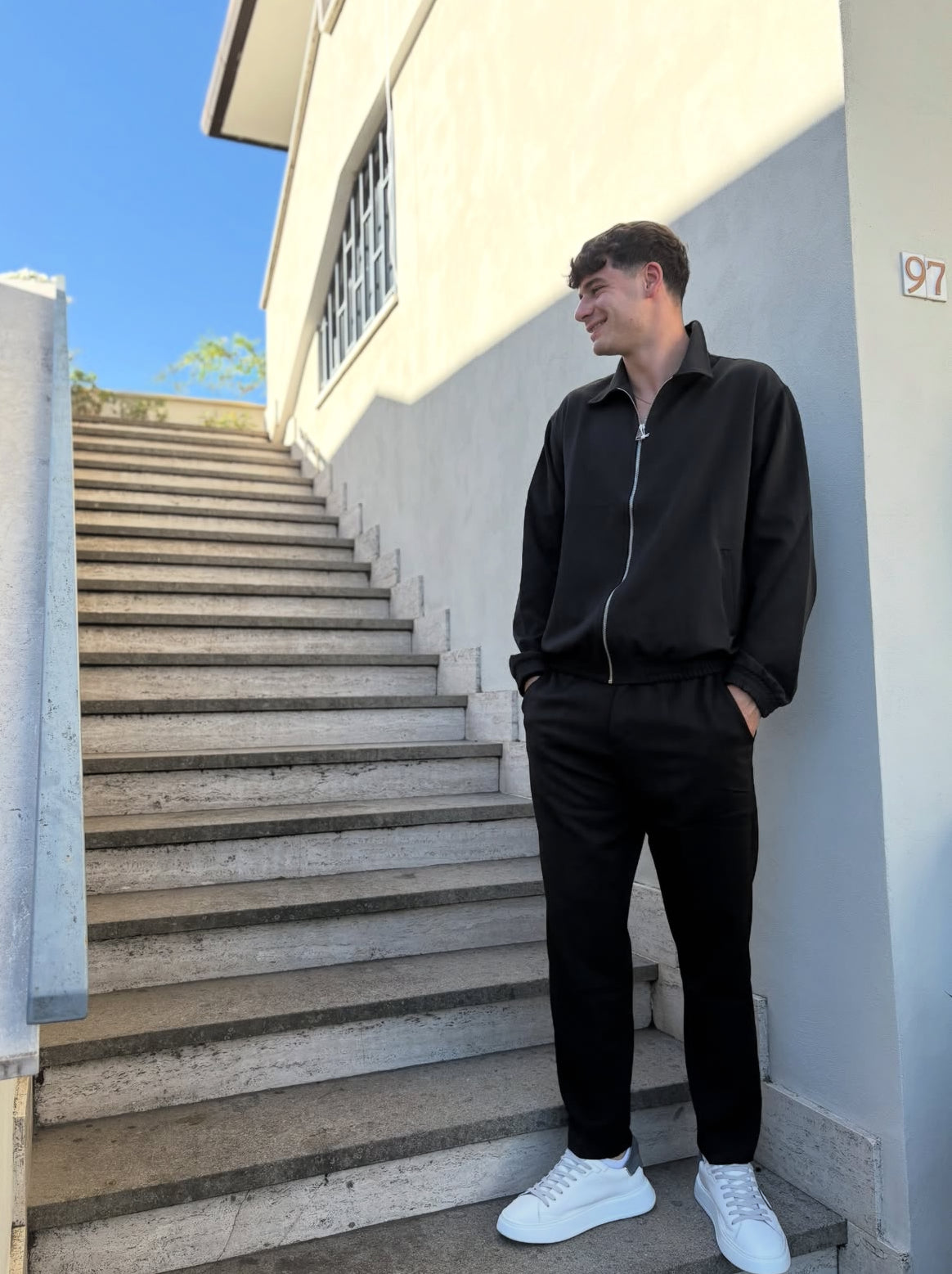 Cordonato uomo con giacca zip con colletto, pantalone modello boyfriend con bottone ed elastico nella parte dietro.