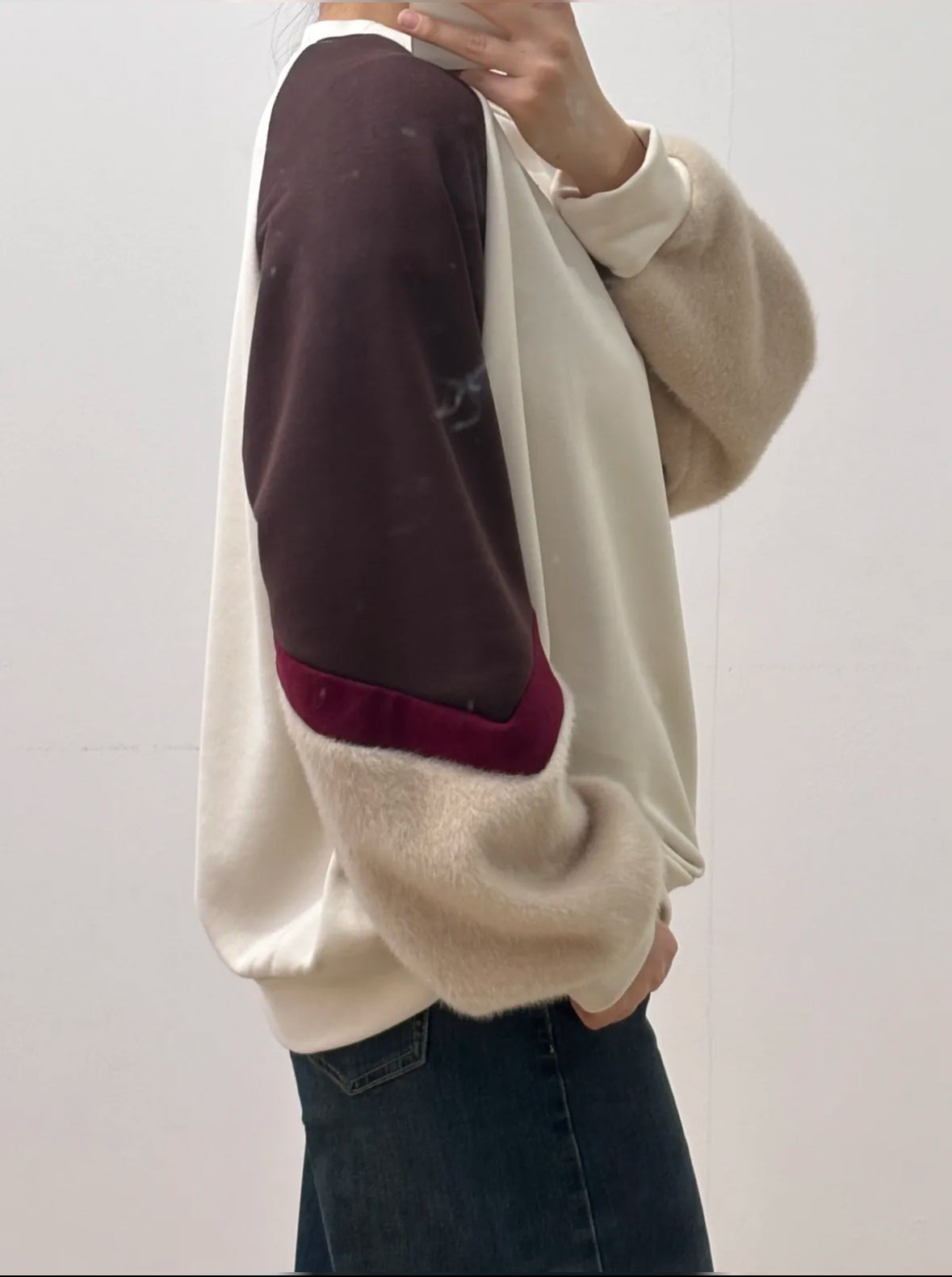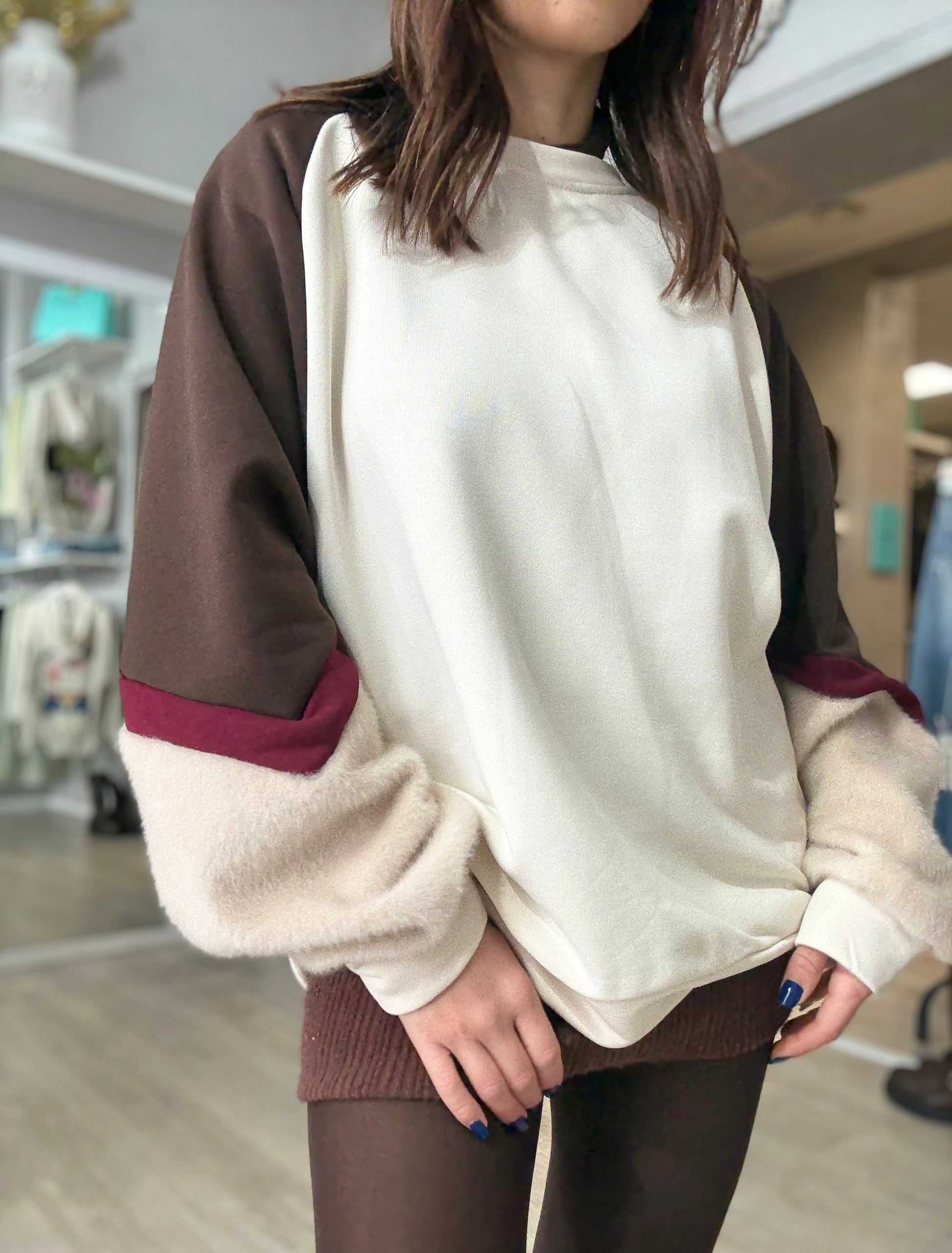 Felpa garzata 100% cotone modello over con manica in pelo ed elastico sul polsino.