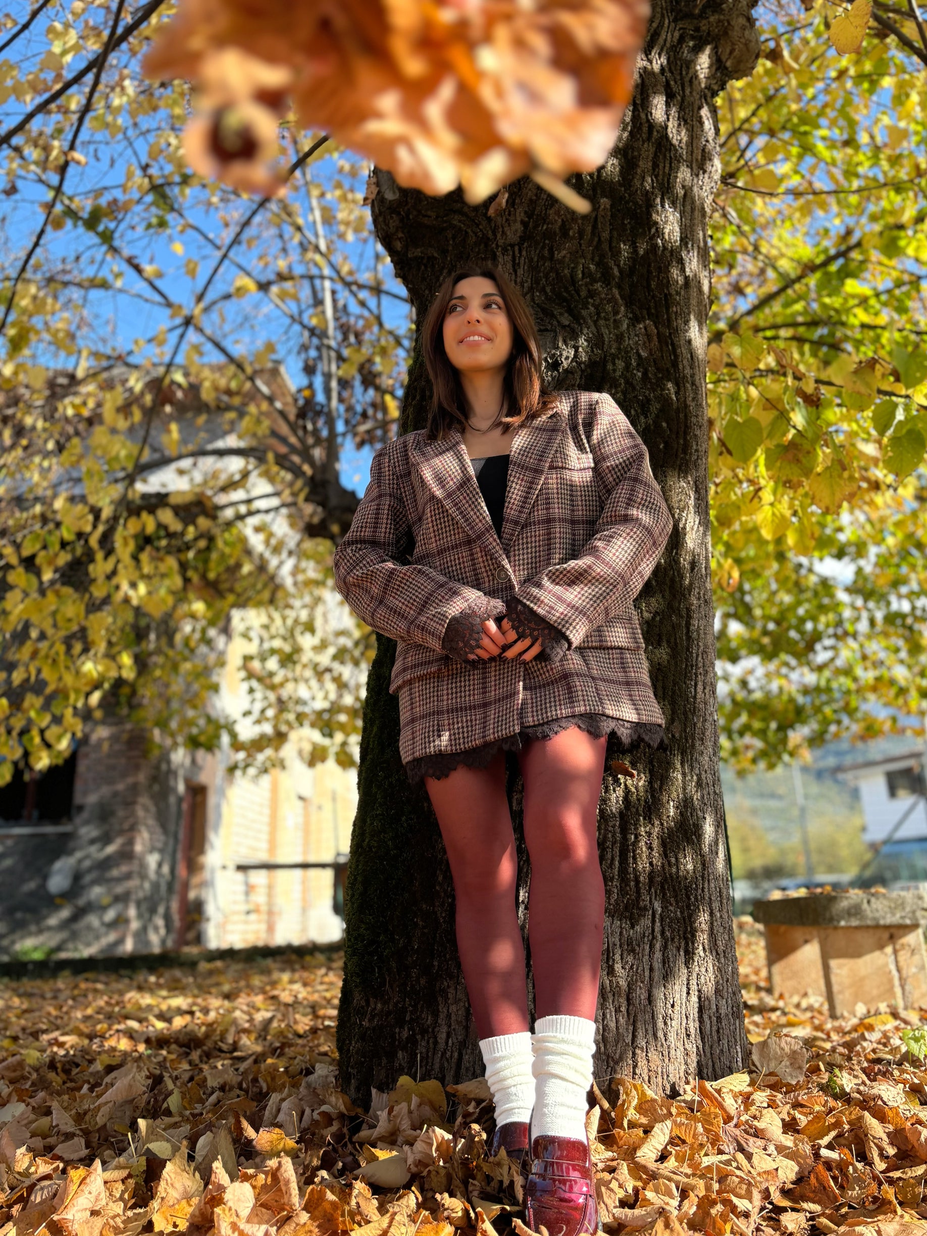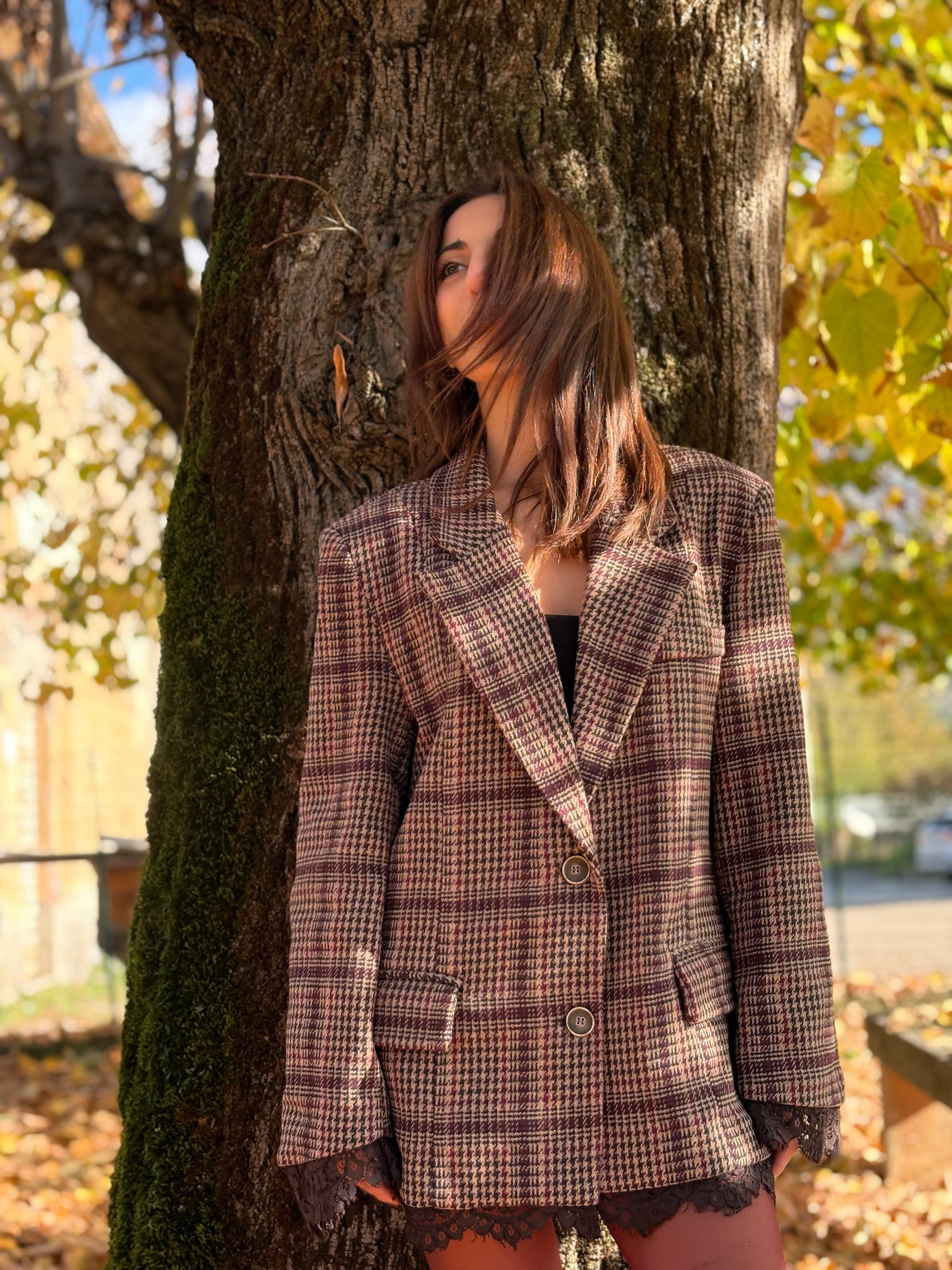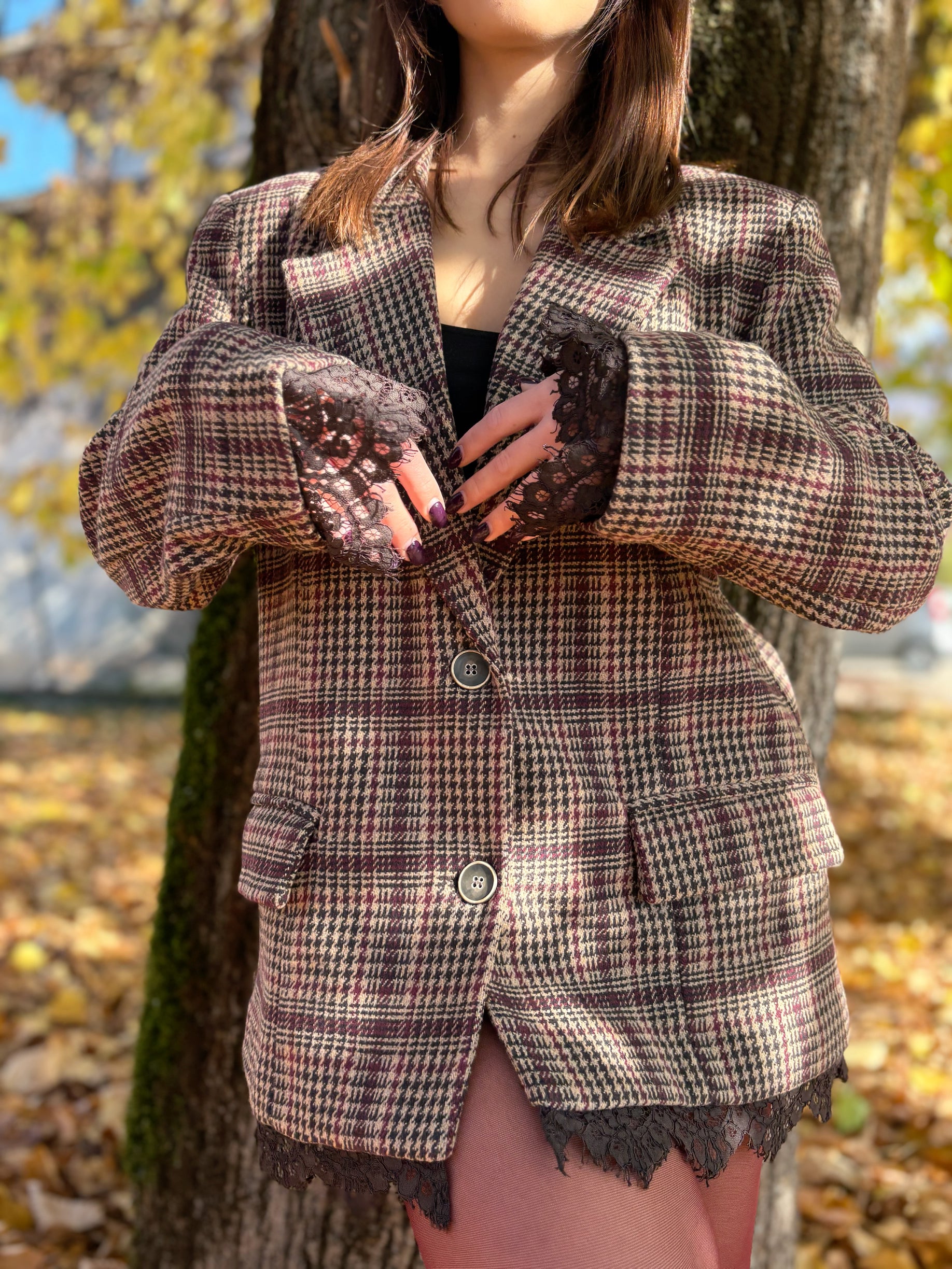 Giacca invernale strutturata pesante in tessuto Quality foderata all’interno con dettagli pizzo che fuoriescono dal polsino e in vita chiusura bottoni.