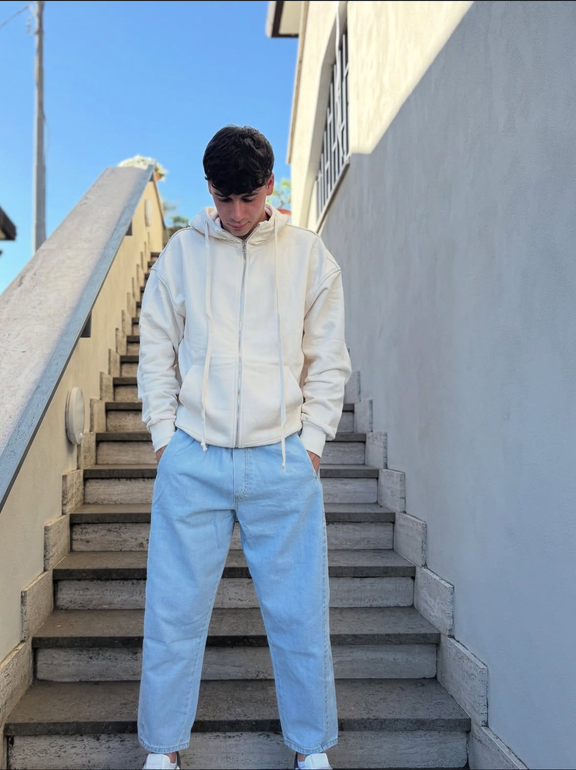 Giacca sportiva con cappuccio e tasconi centrale vestibilità over, molto comoda. Tessuto cotone garzato