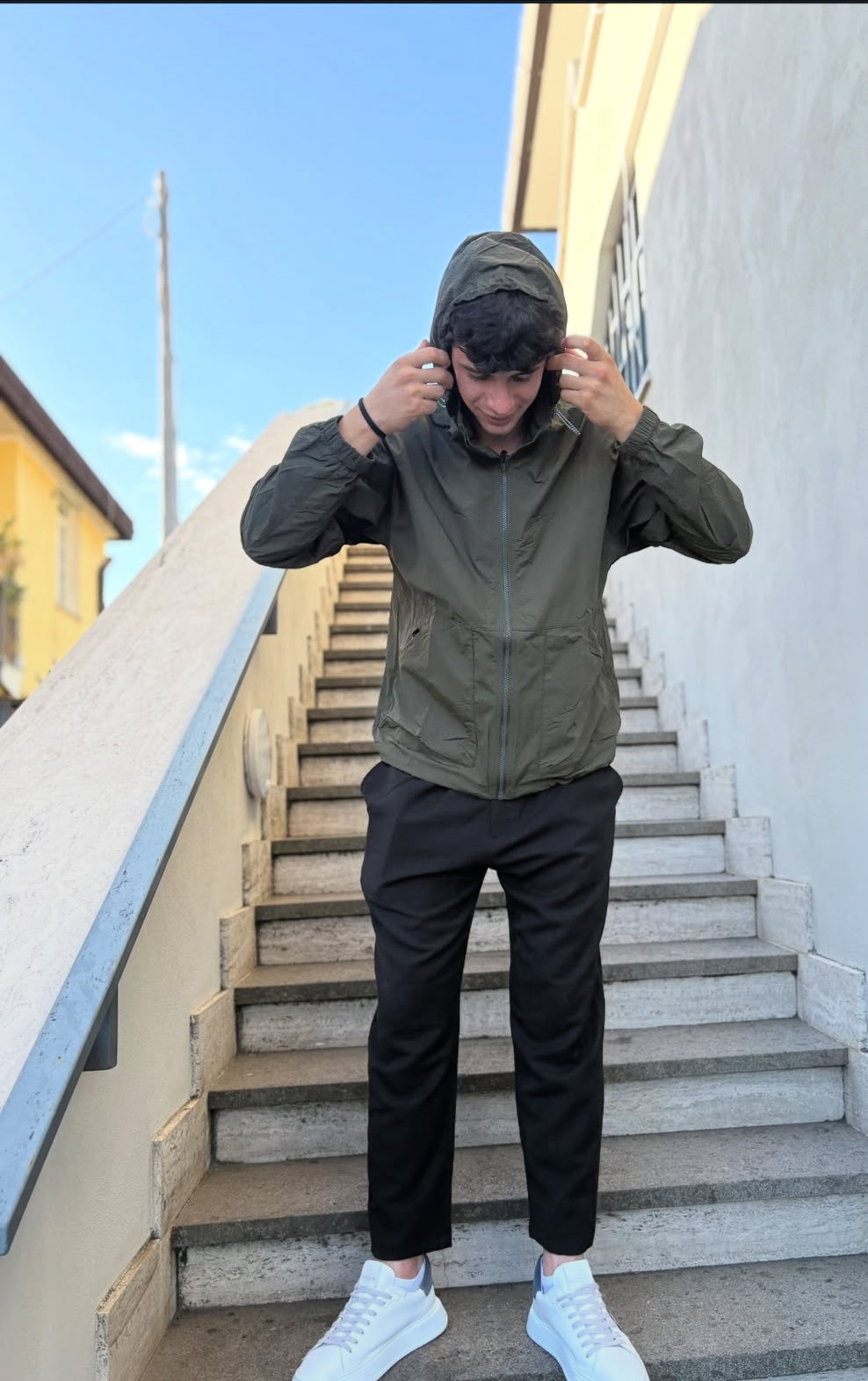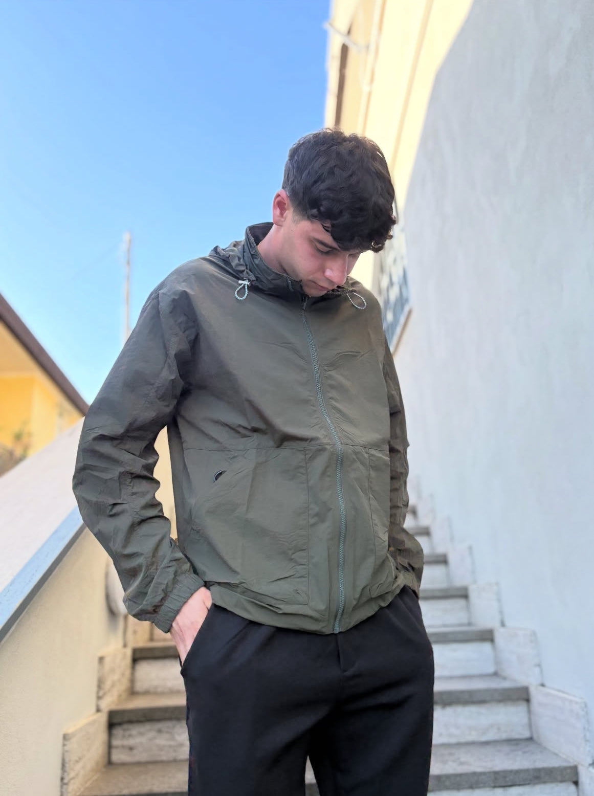 Giacca a vento con cappuccio, tessuto tecnico con tasche.