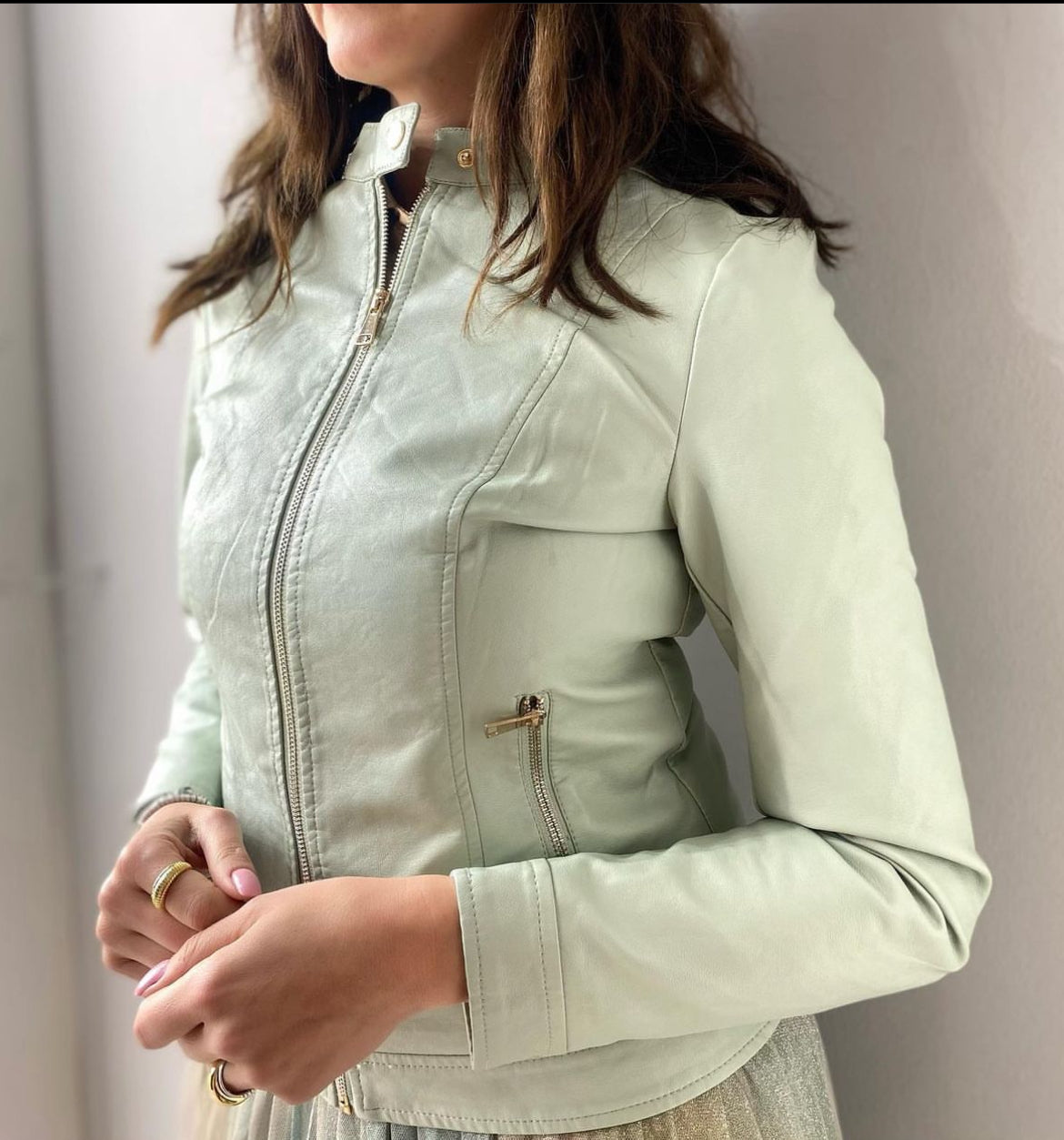 Giubbotto ecopelle colletto alla core a con zip e bottone sul collo