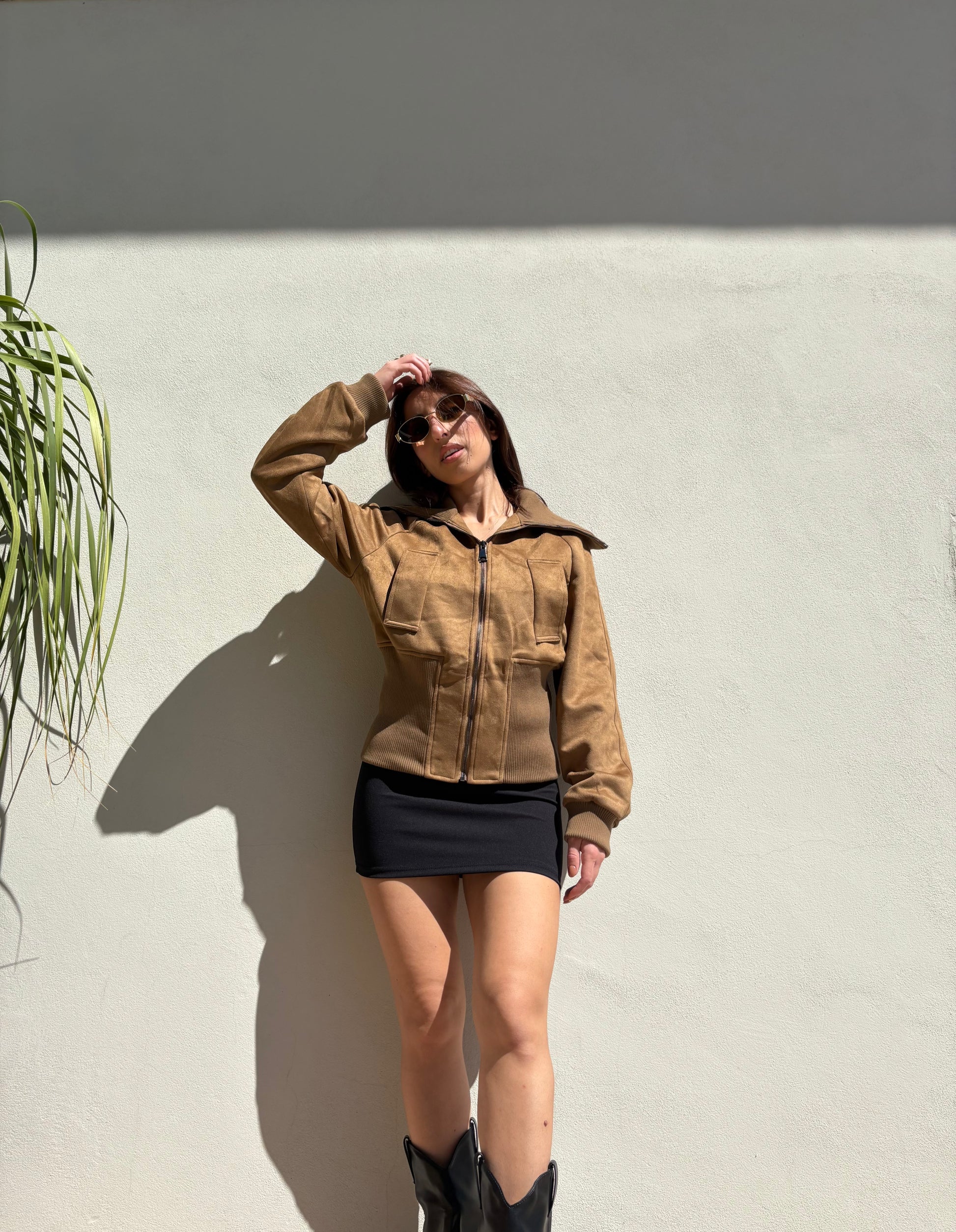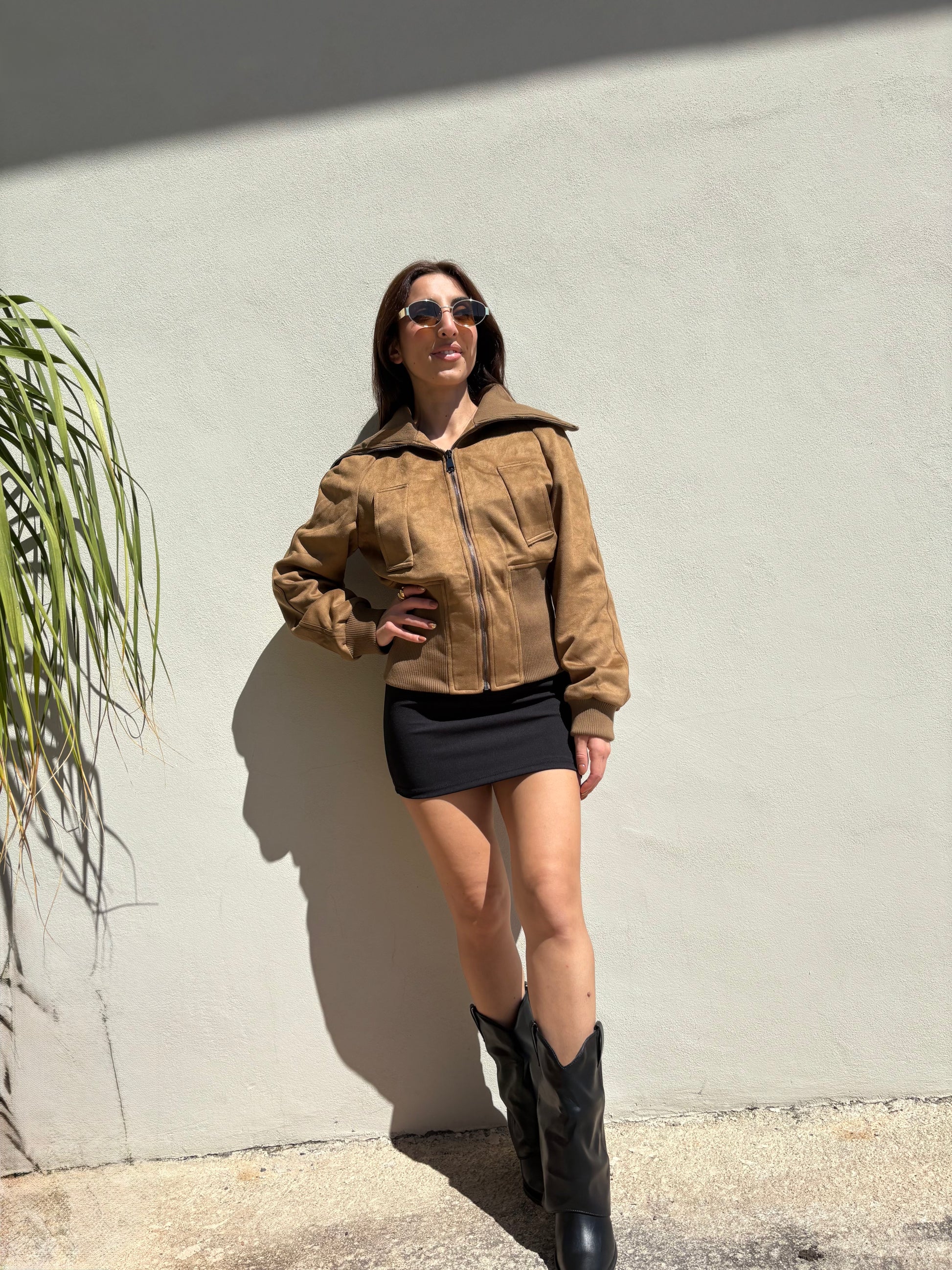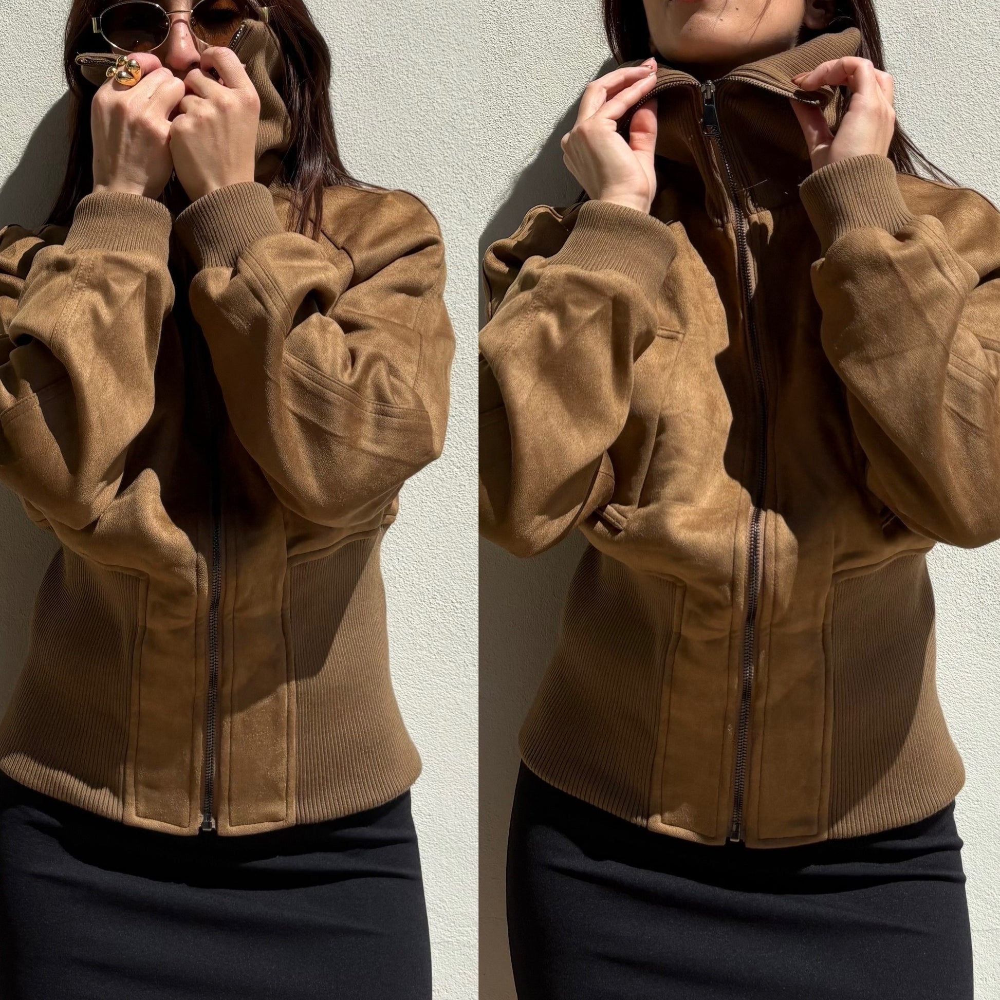Giubbotto scamosciato morbido foderato all’interno perfetto per la stagione invernale, con elastico sul polso, crea una silhouette sulla vita.