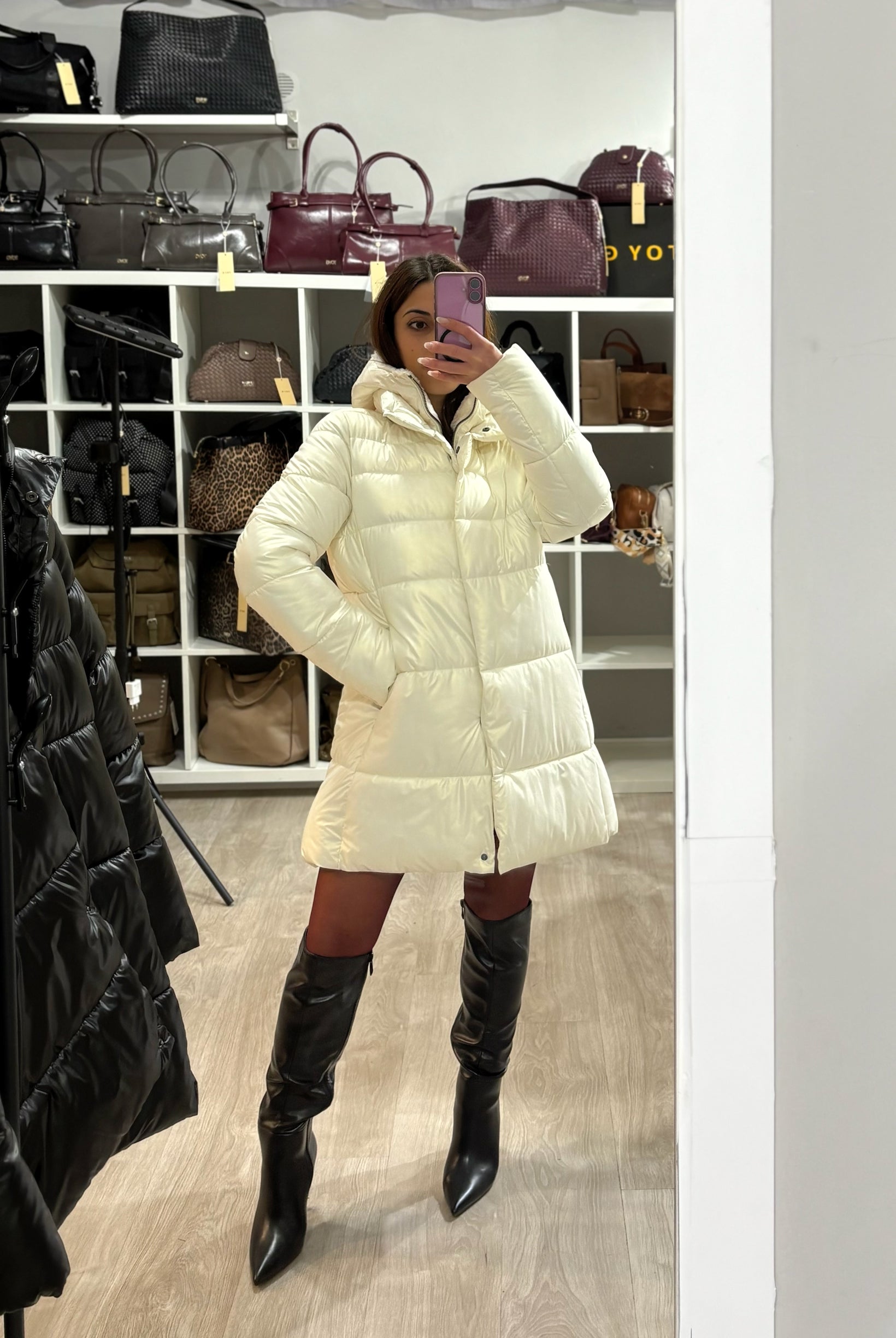 Giubbotto con cappuccio in pelliccia, ha la pettorina con zip e chiusura a giubbotto. Lunghezza sopra al ginocchio.