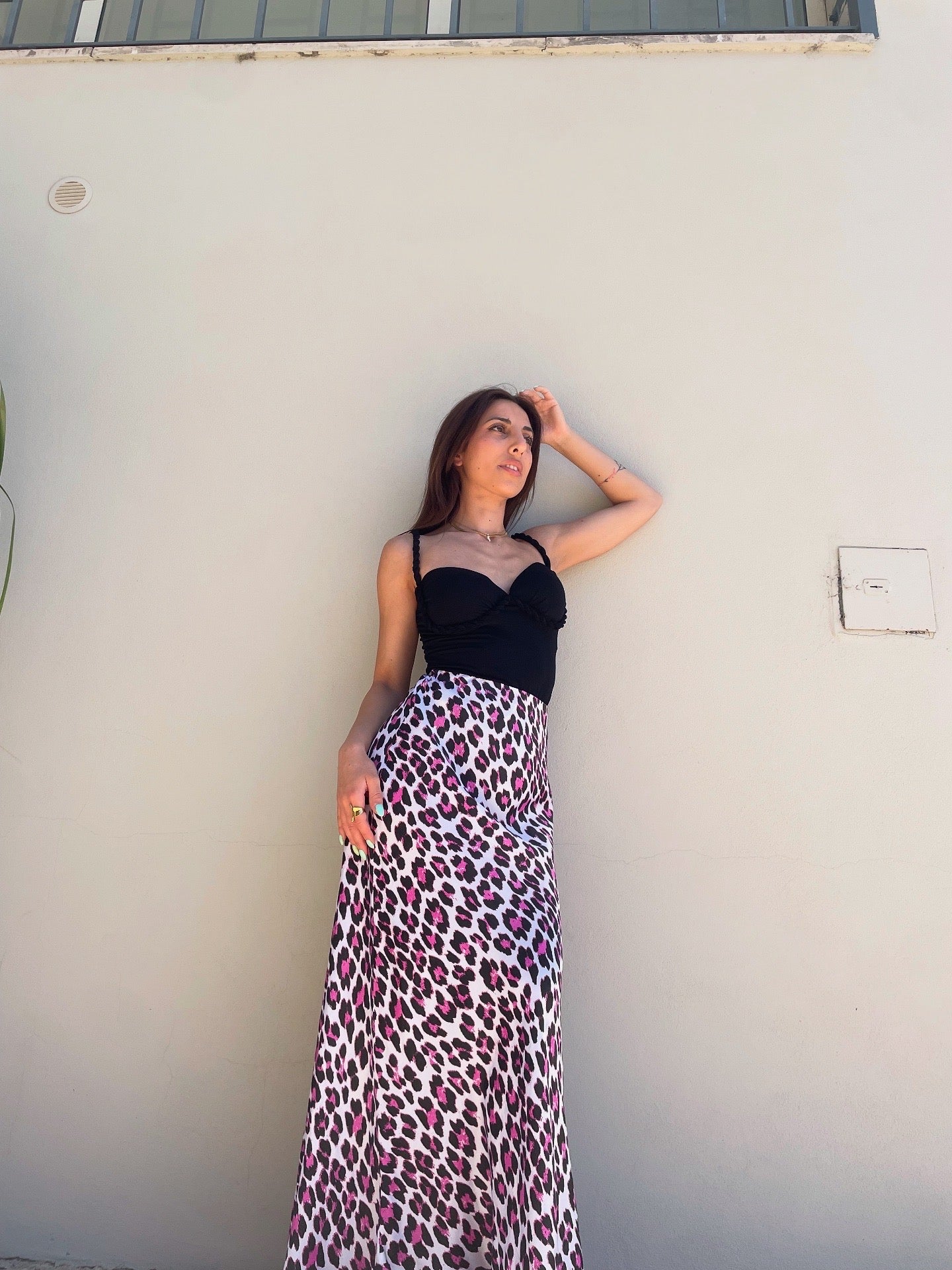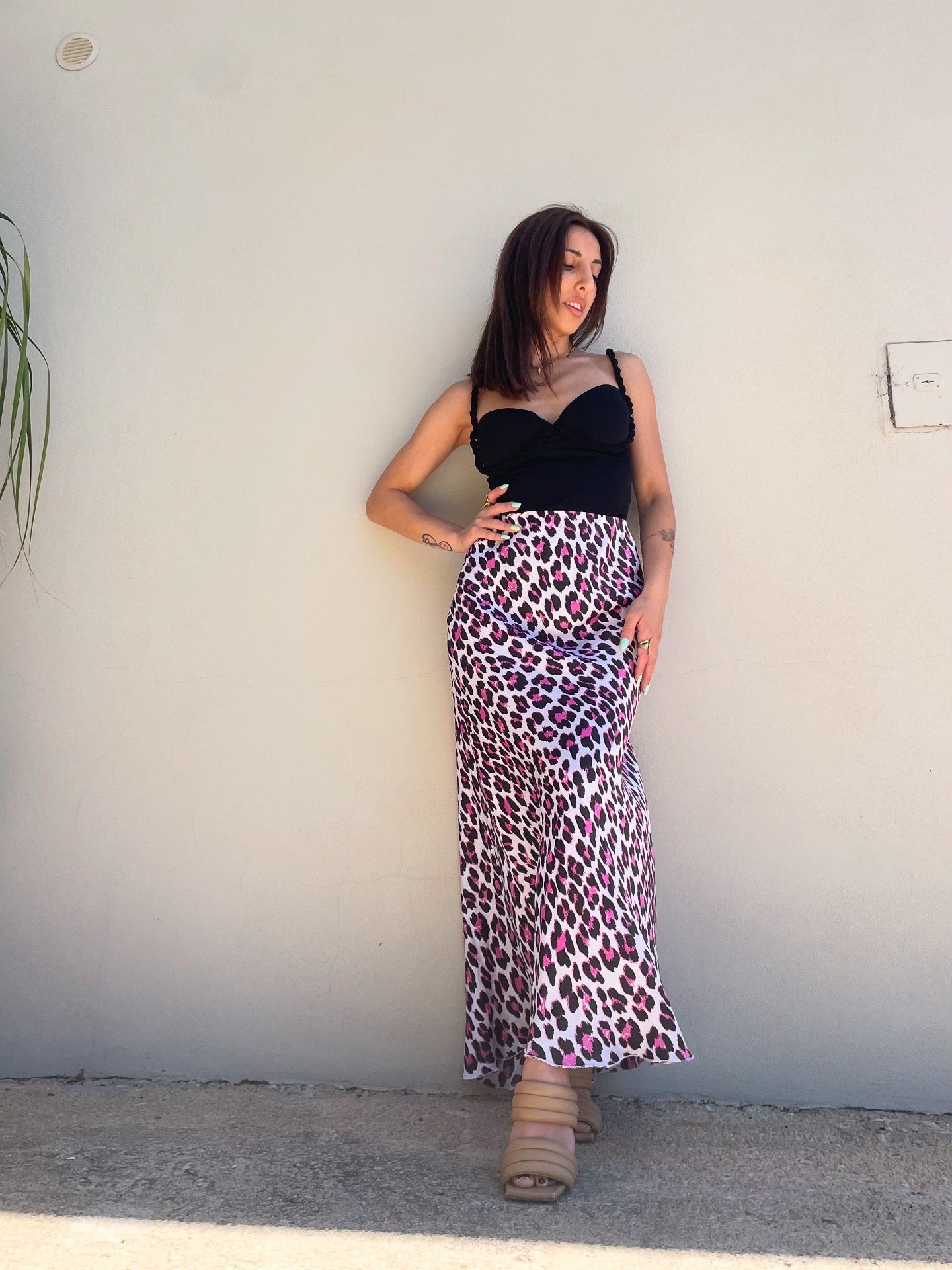 Gonna lunga modello sirena effetto balza nella parte finale con stampa in cotone animalier. Elastico in vita.