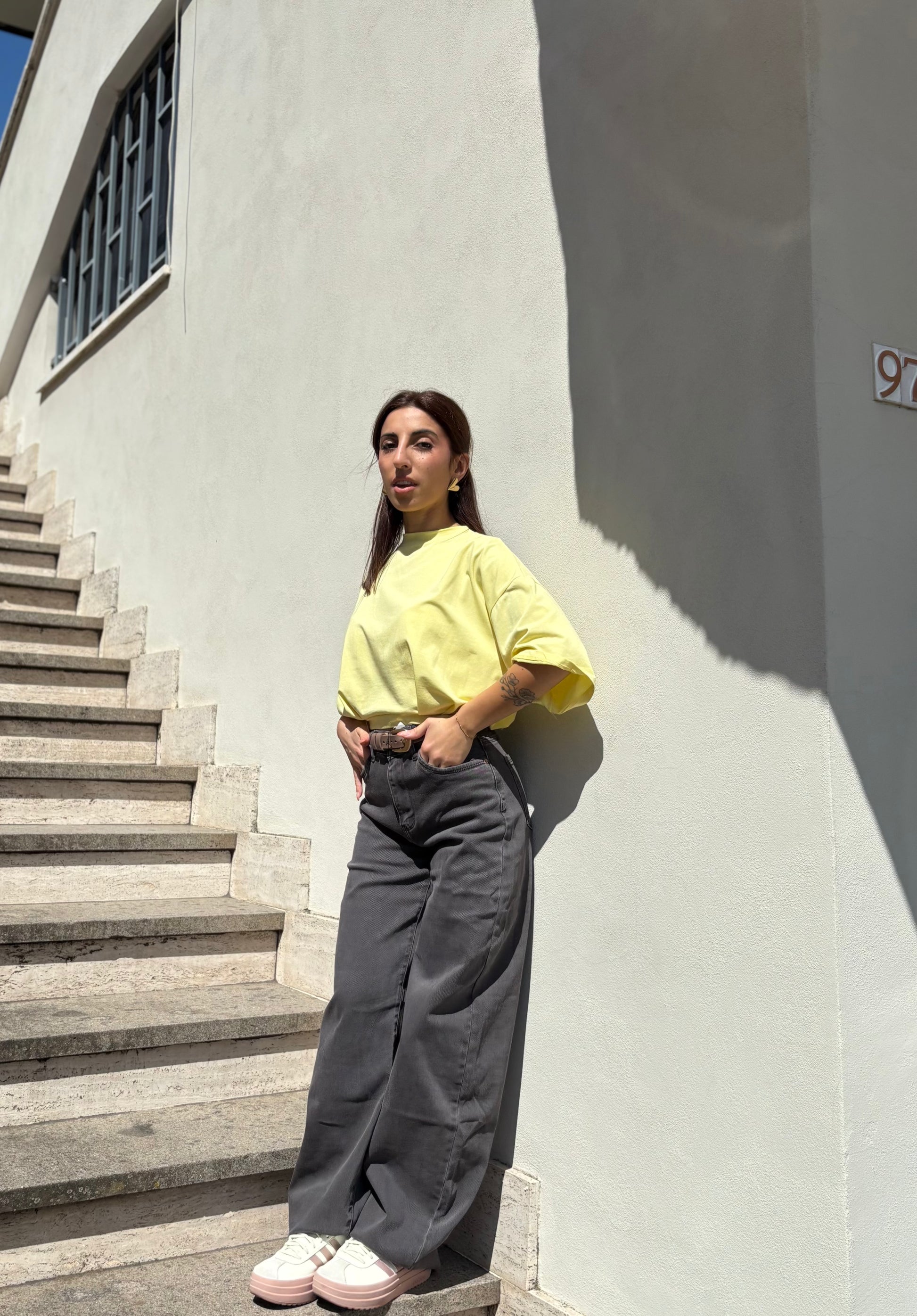 Jeans grigio scuro con bottone, vita regolare modello balloon leggermente ampio.