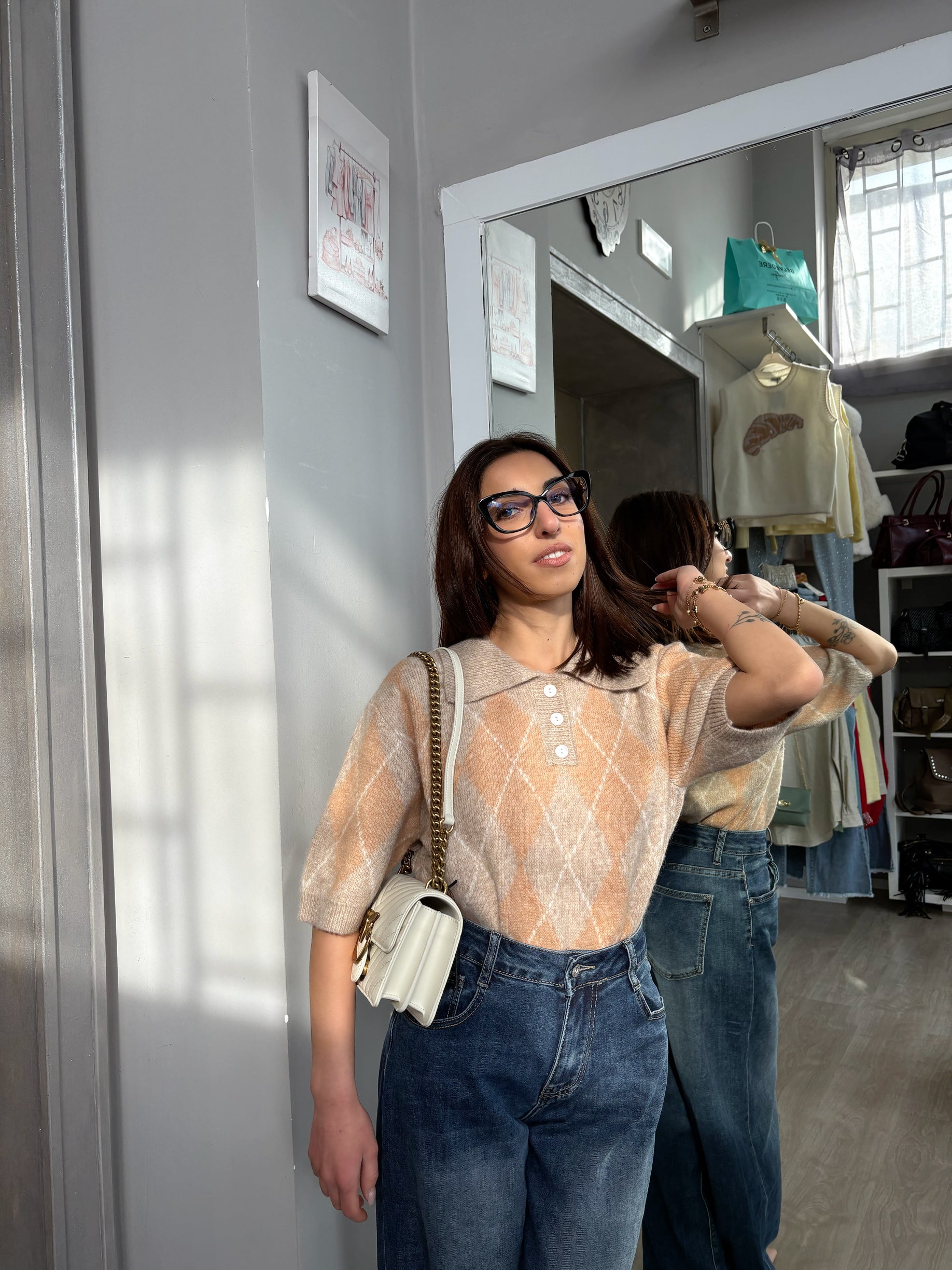 Maglione polo mezza manica, tessuto elasticizzato. Fantasia rombi.