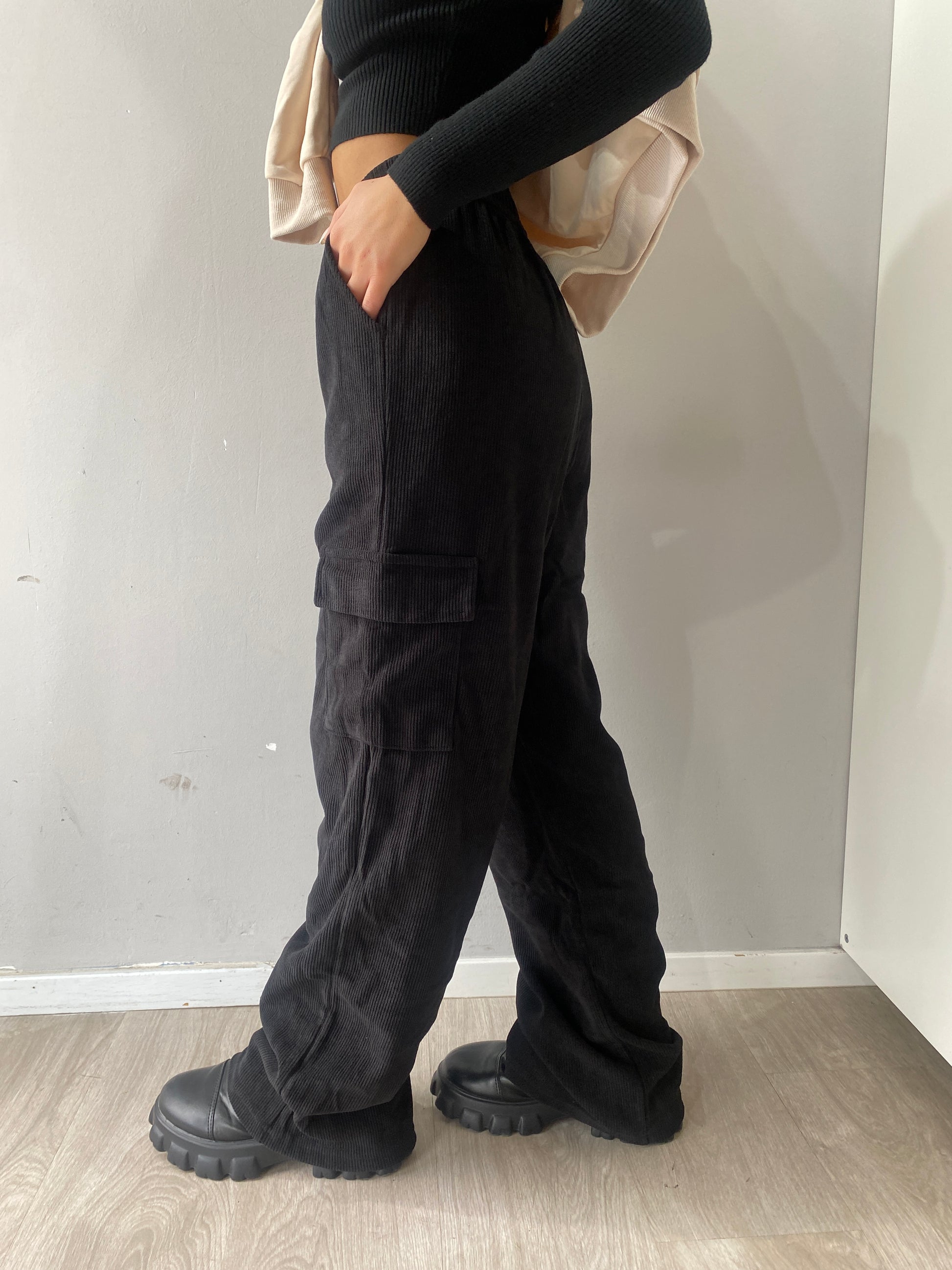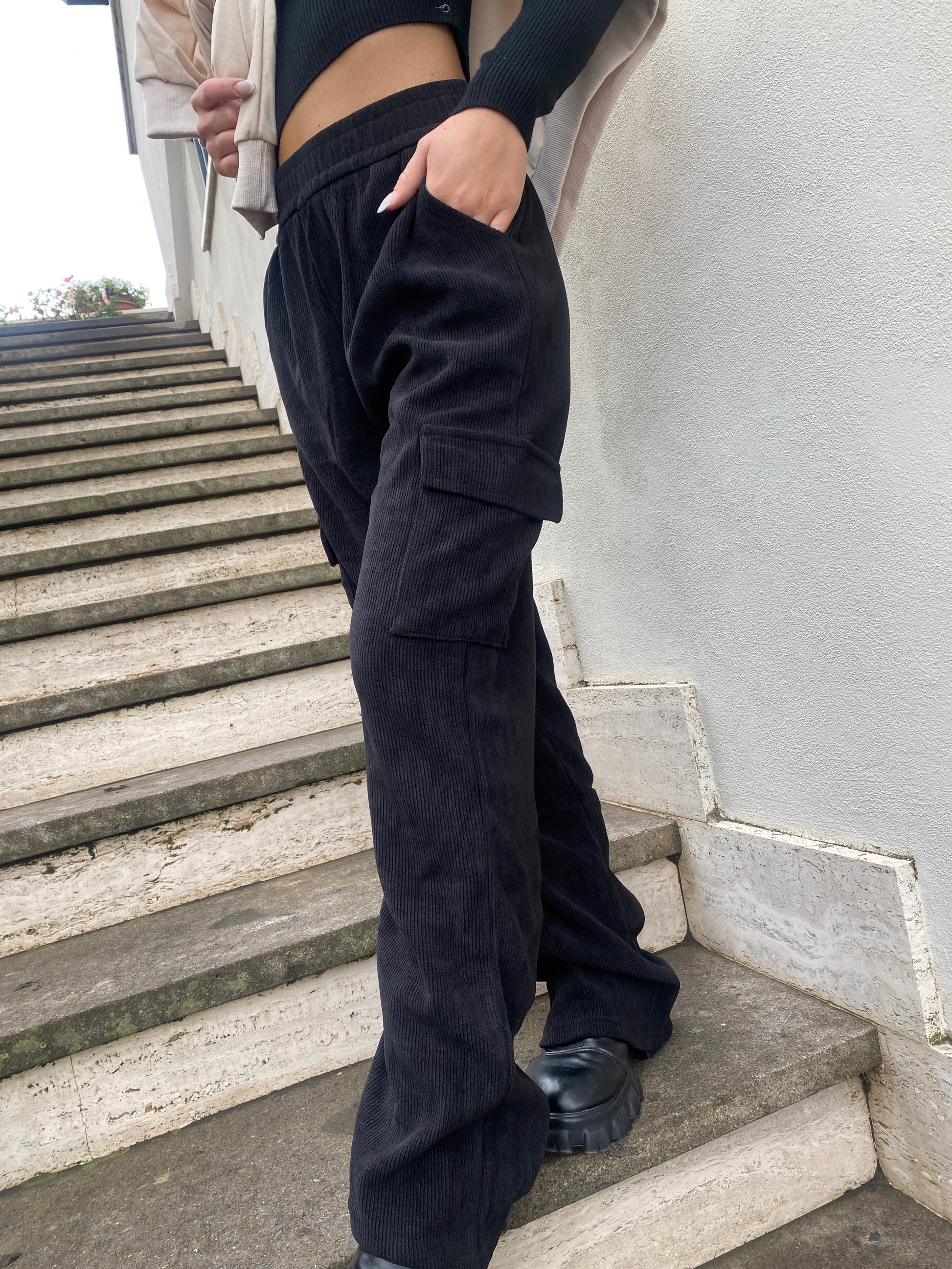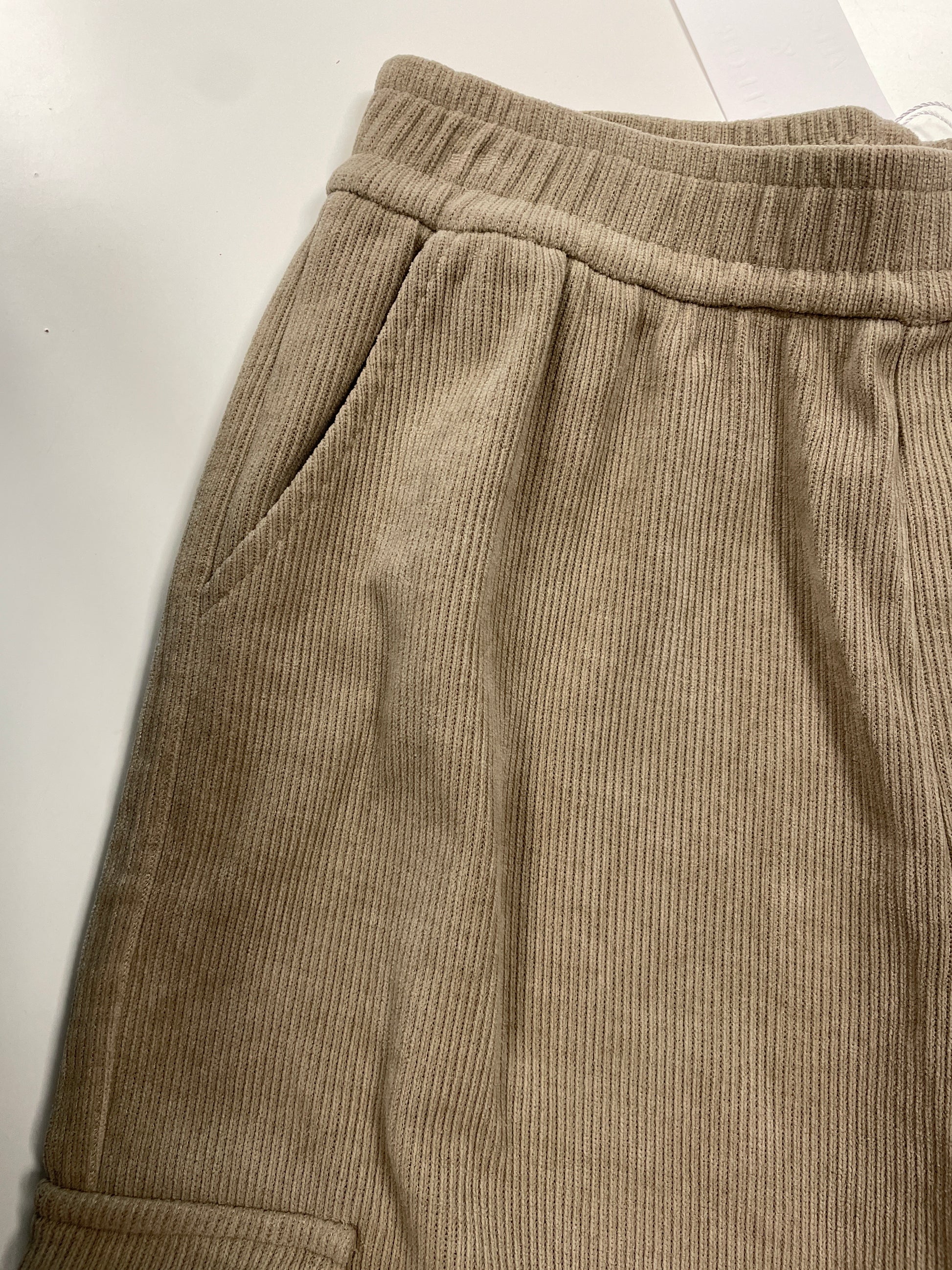 Pantalone morbido in tessuto scamosciato a costine con elastico in vita.