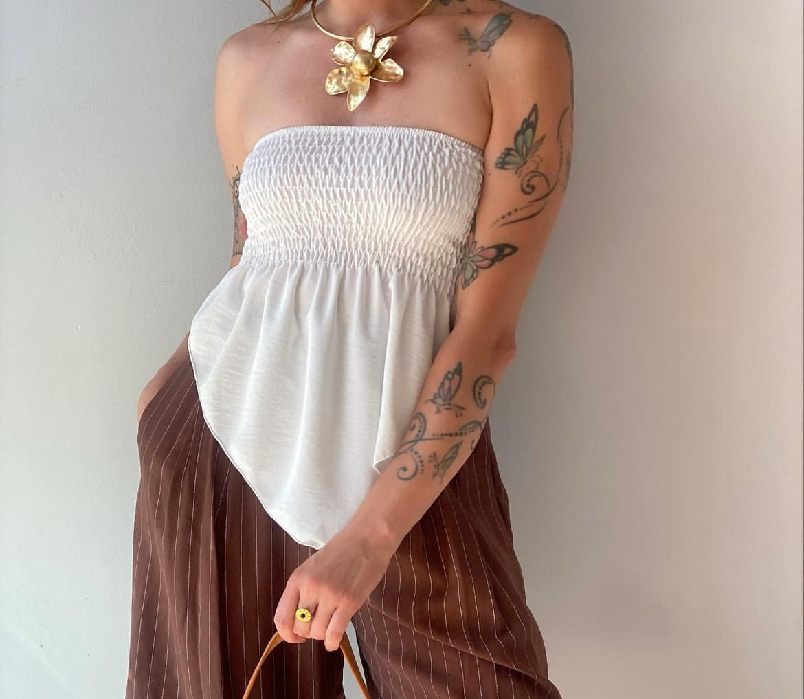 Top scollo barchetta con elastico e particolarità punta finale.