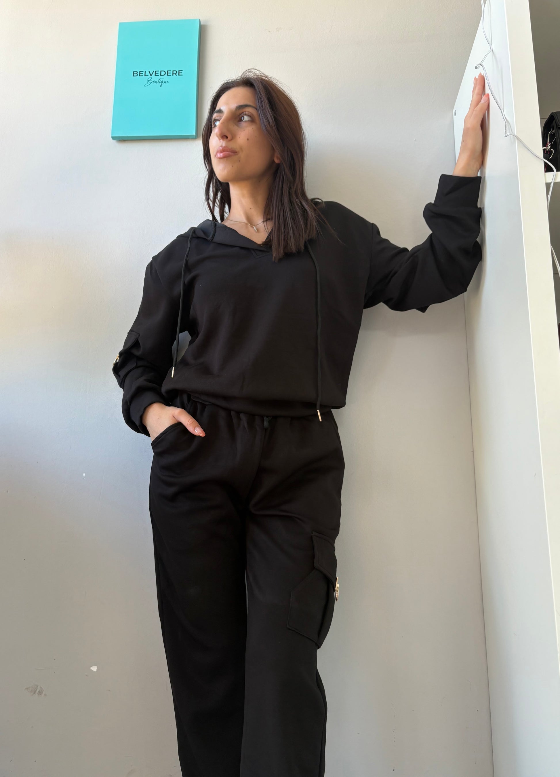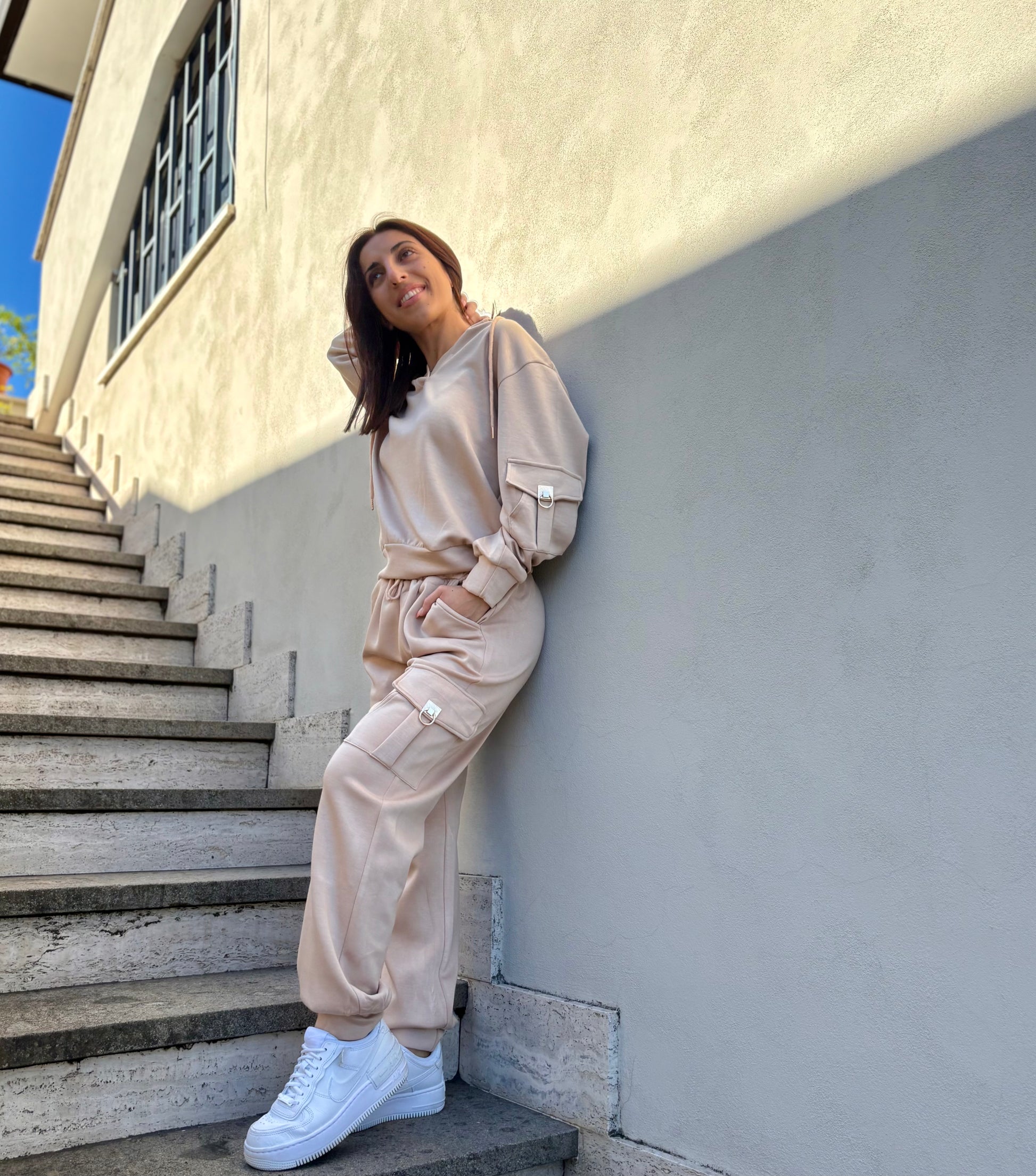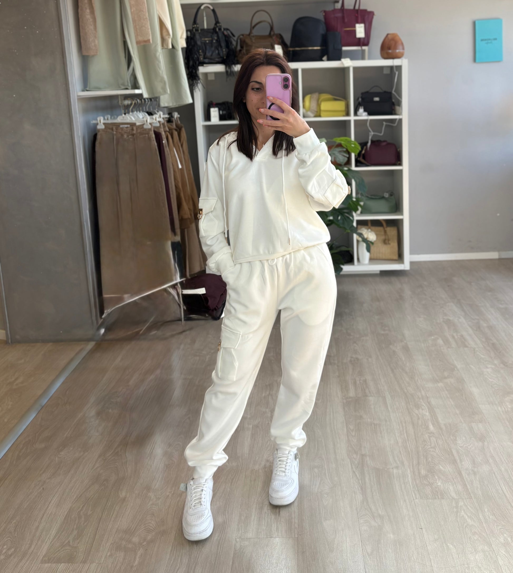 Tuta cargo molto comoda e morbida. La felpa ha il cappuccio e il pantalone ha l'elastico
