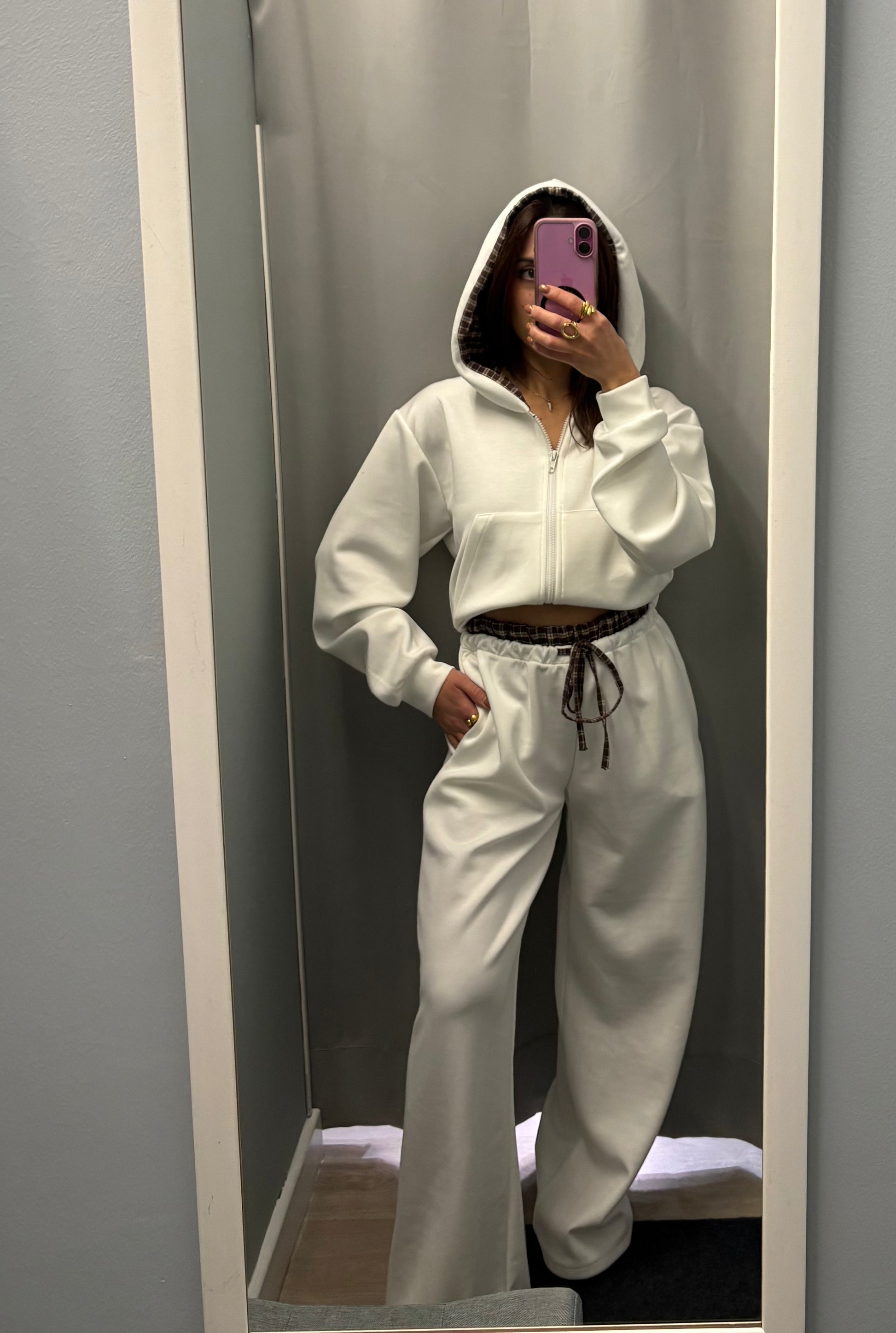 Tuta casual in caldo cotone, morbida e resistente per questa stagione invernale. Con cappuccio fantasia quadretti e elastico in vit del pantalone quadretti.