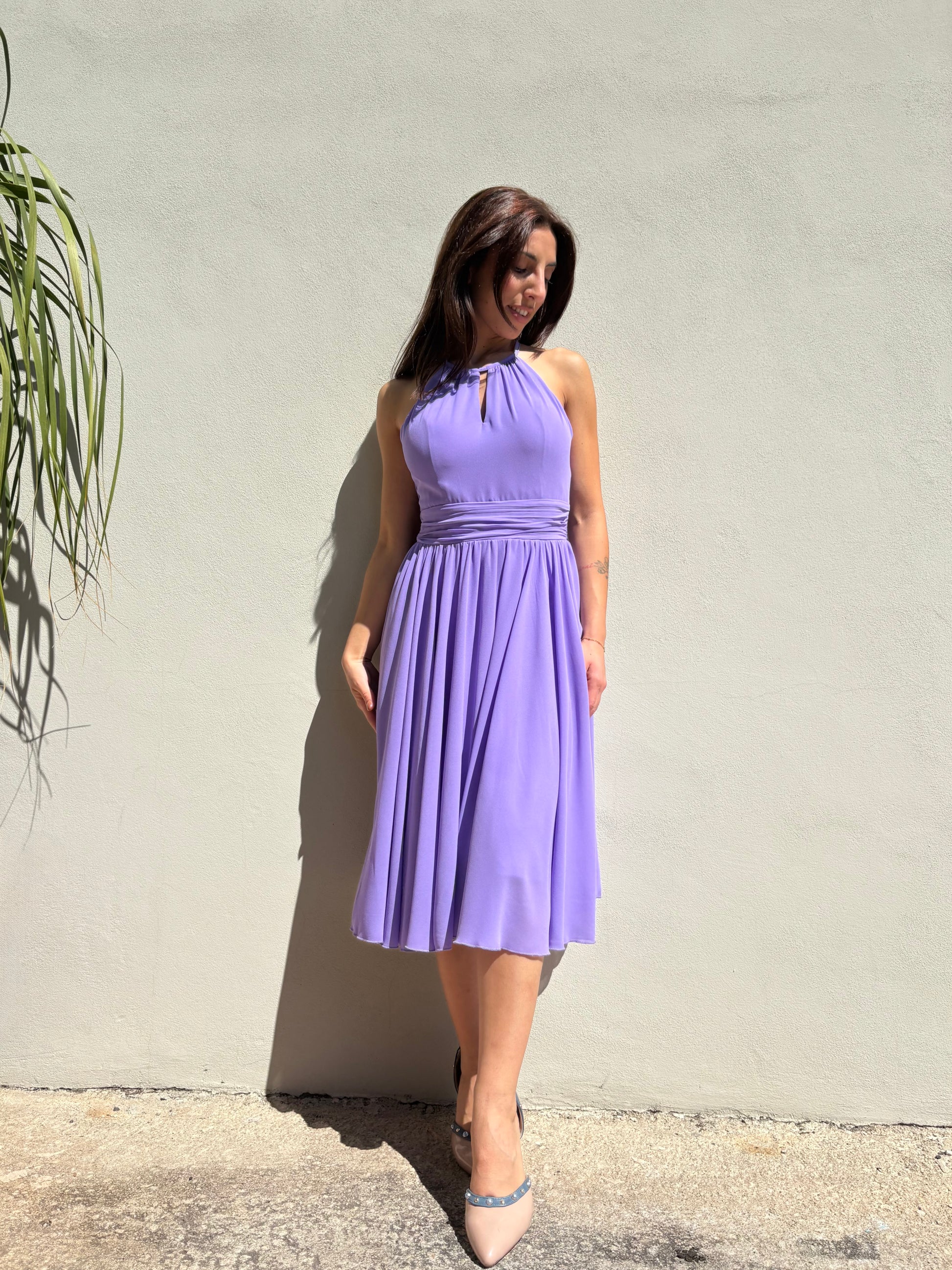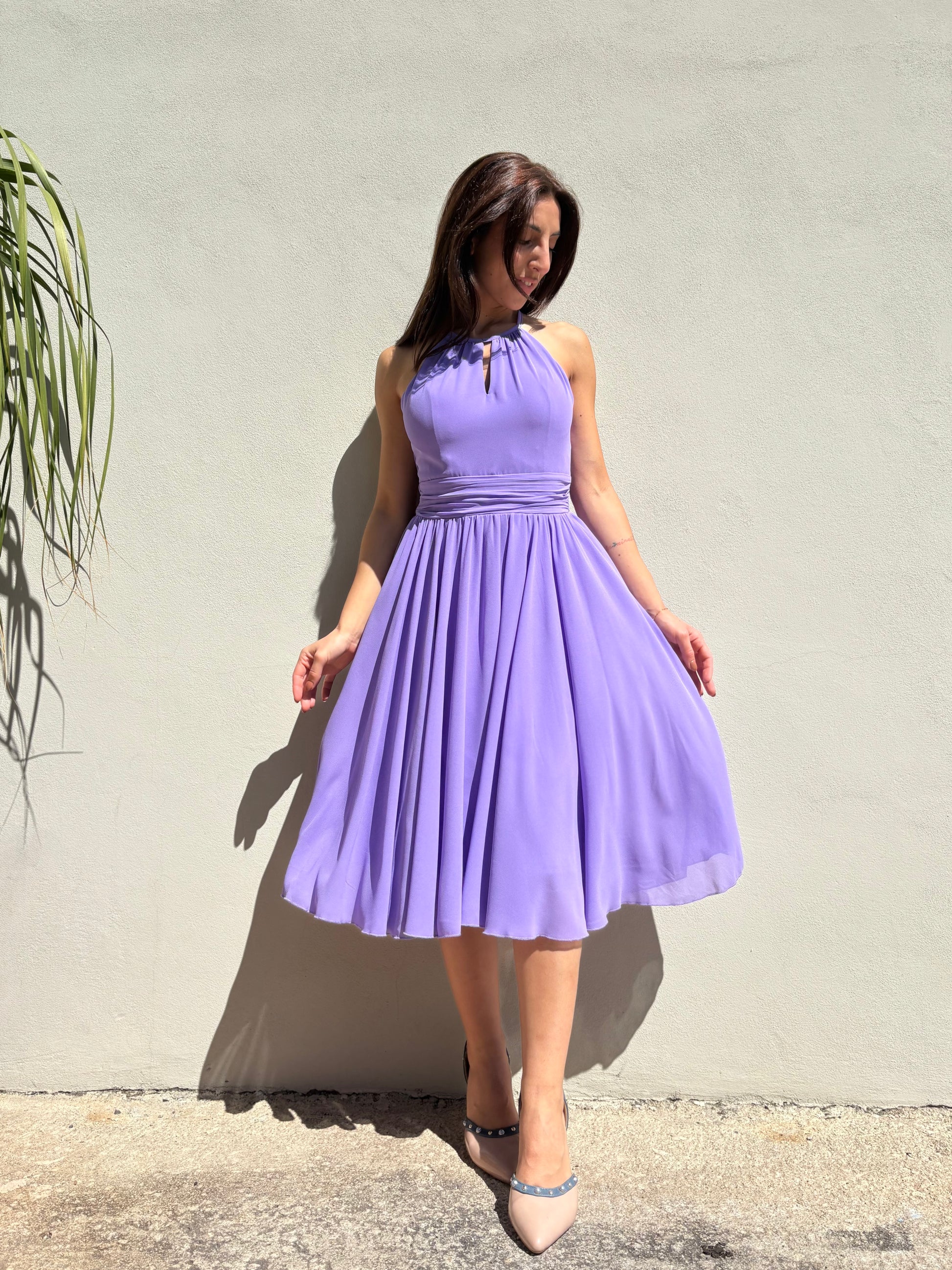 Vestito con abbottonatura dietro al collo e apertura dietro la schiena, aderente in vita con balze che scendono sui fianchi