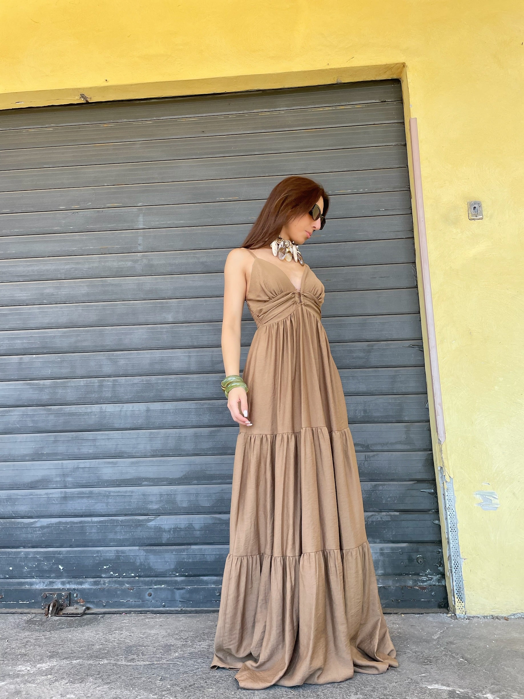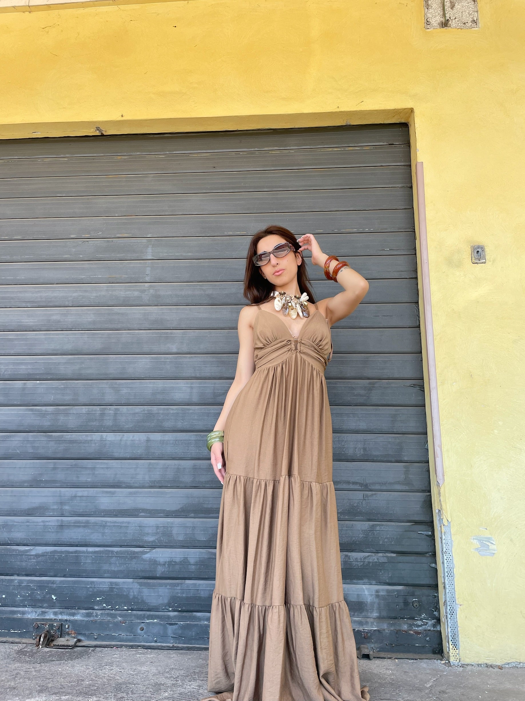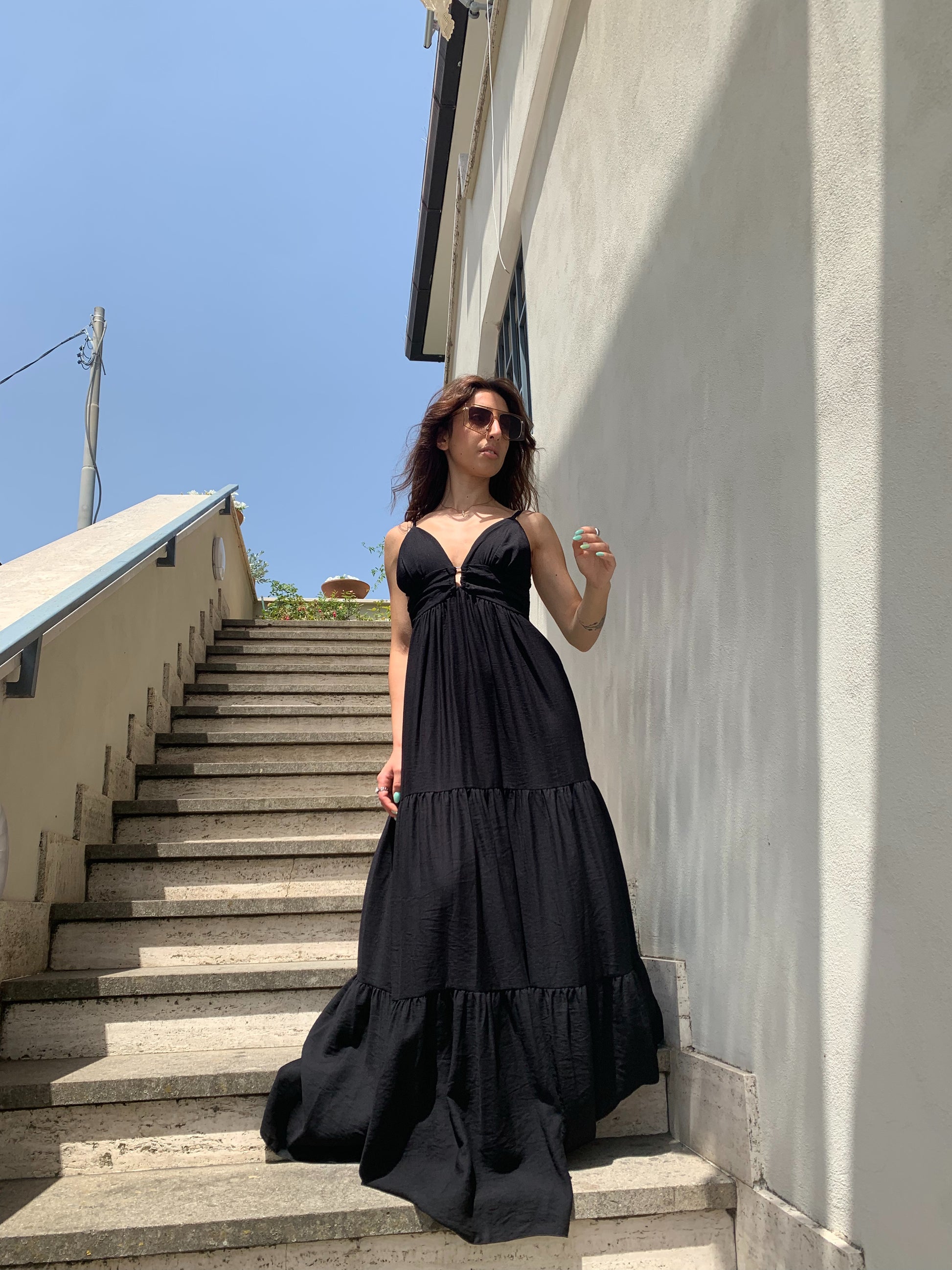 Abito lungo con motivo a balze, coppa a conchiglia e dettaglio cerchio punto vita, dietro la schiena tessuto elasticizzato. Consigliato per taglia 38/40/42