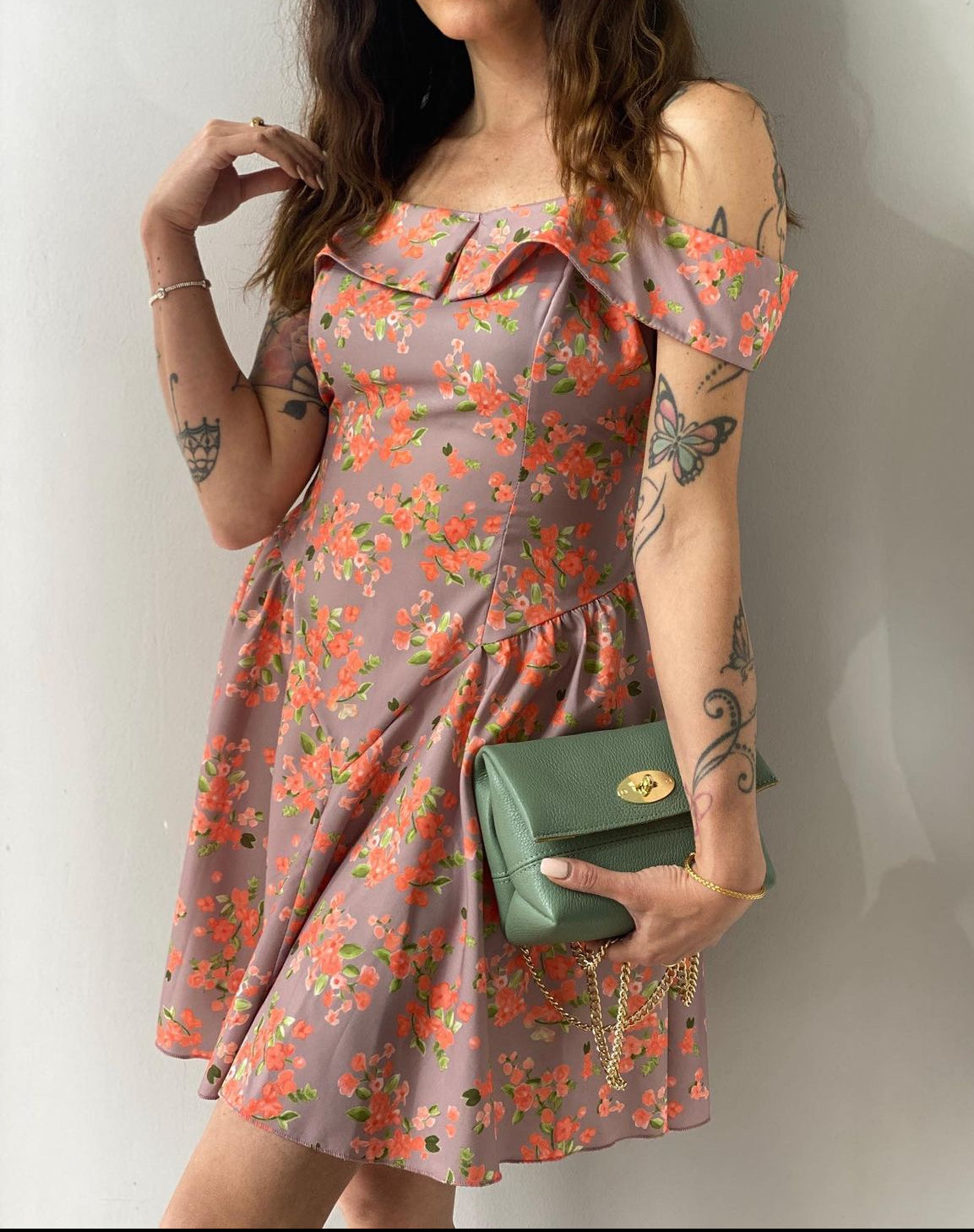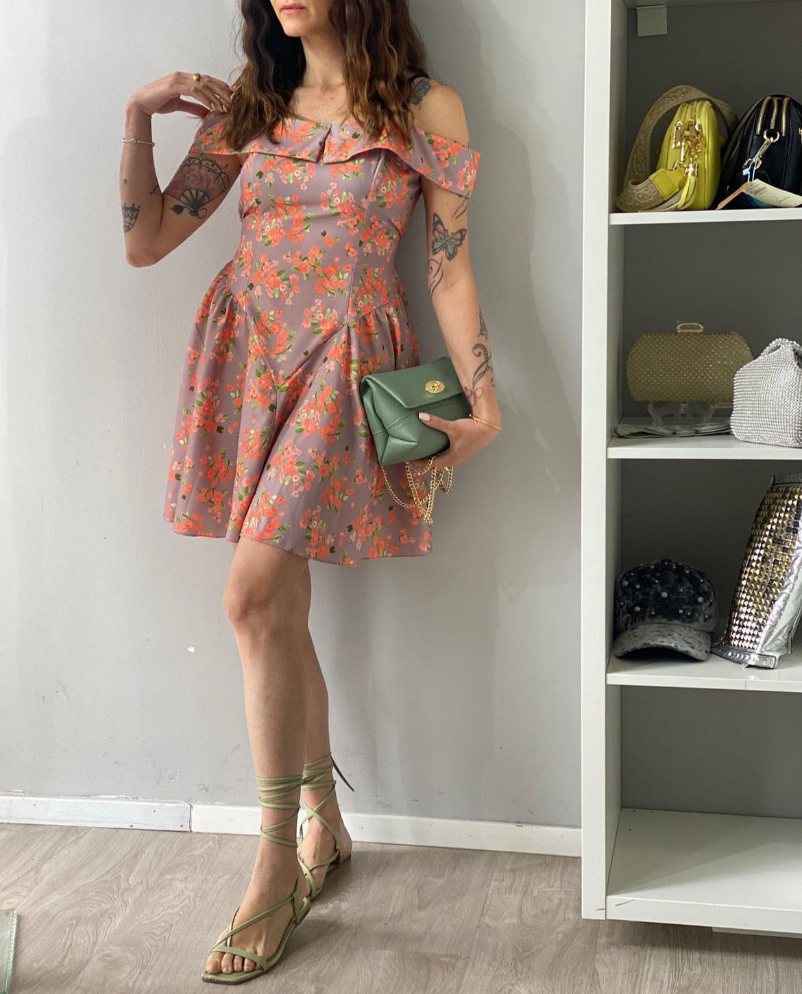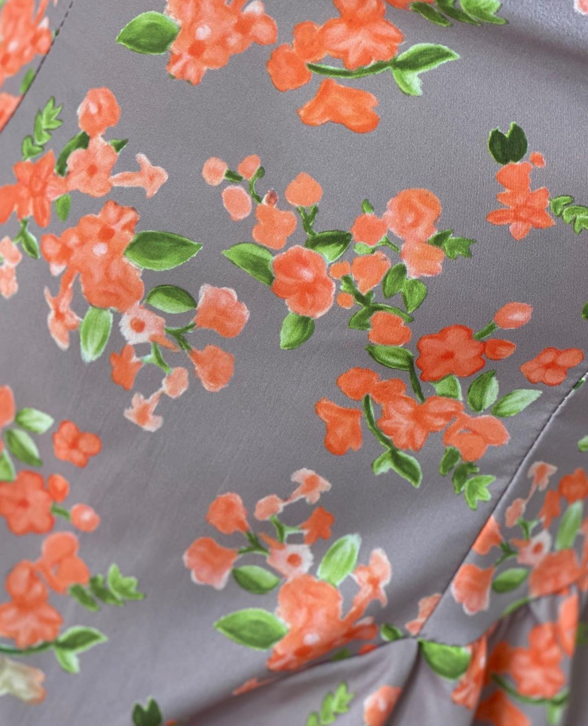 Vestito fantasia floreale con scollo a barchetta, disegno a V, bretellina regolabile. Morbido sui fianchi