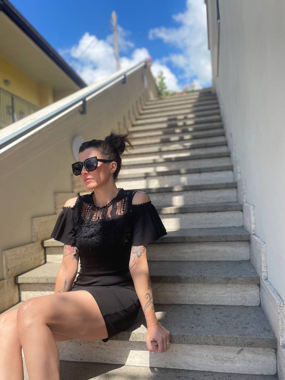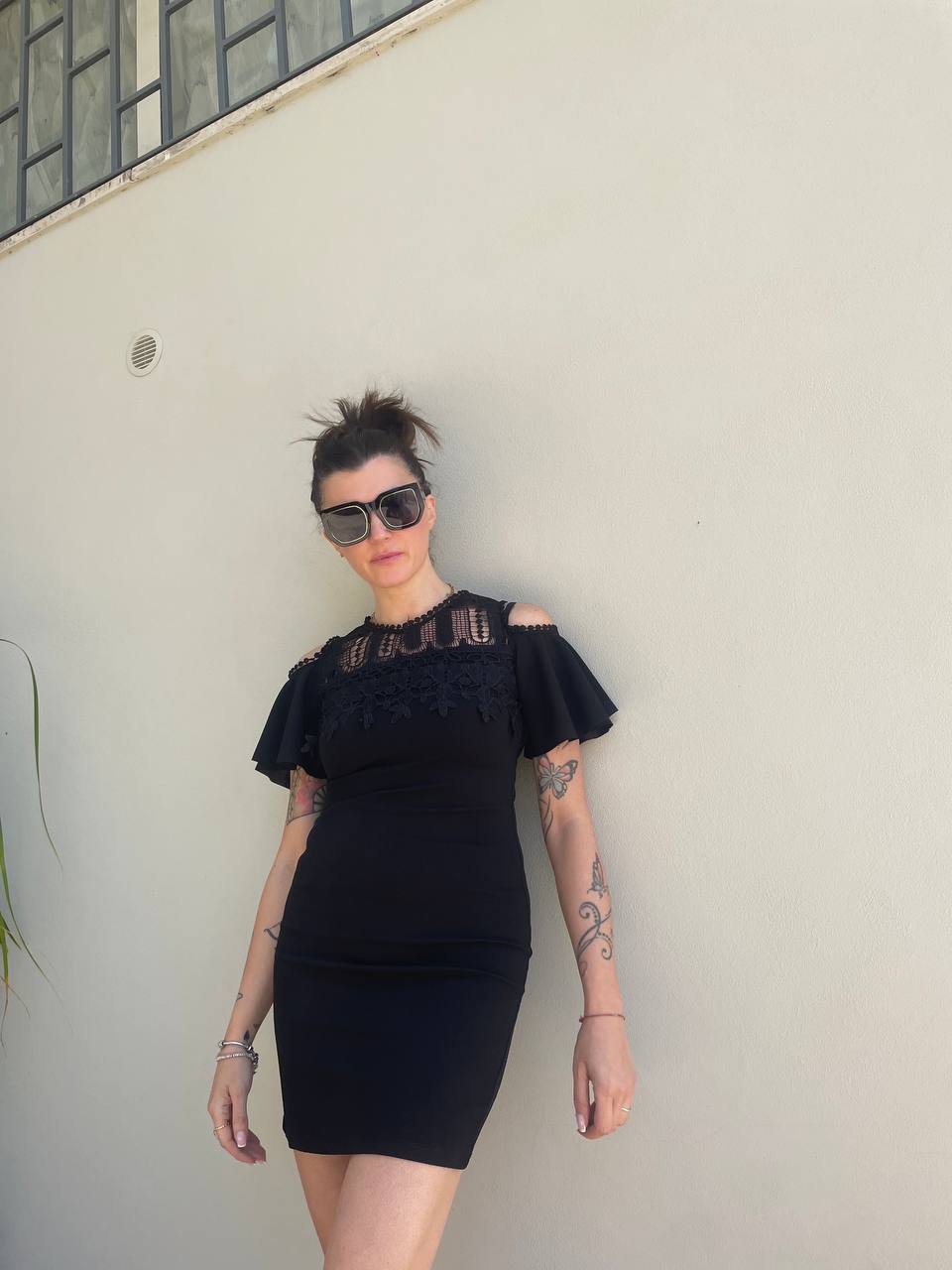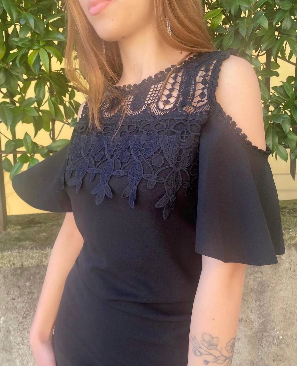 Vestito aderente elasticizzato con pizzo e manica voliant, apertura sulle spalle